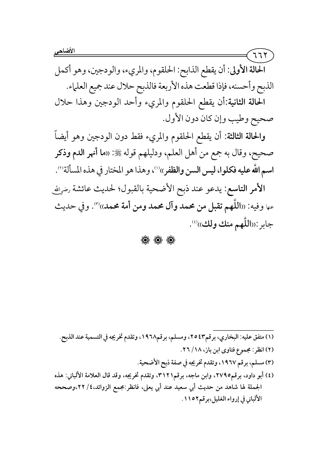 الأمر التاسع: يدعو عند ذبح الأضحية بالقبول؛ لحديث عائشة رضي اللَّه عنها وفيه: ((اللَّهم تقبل من محمد وآل محمد ومن أمة محمد)) (¬3). وفي حديث جابر: ((اللَّهم منك ولك)) (¬4).