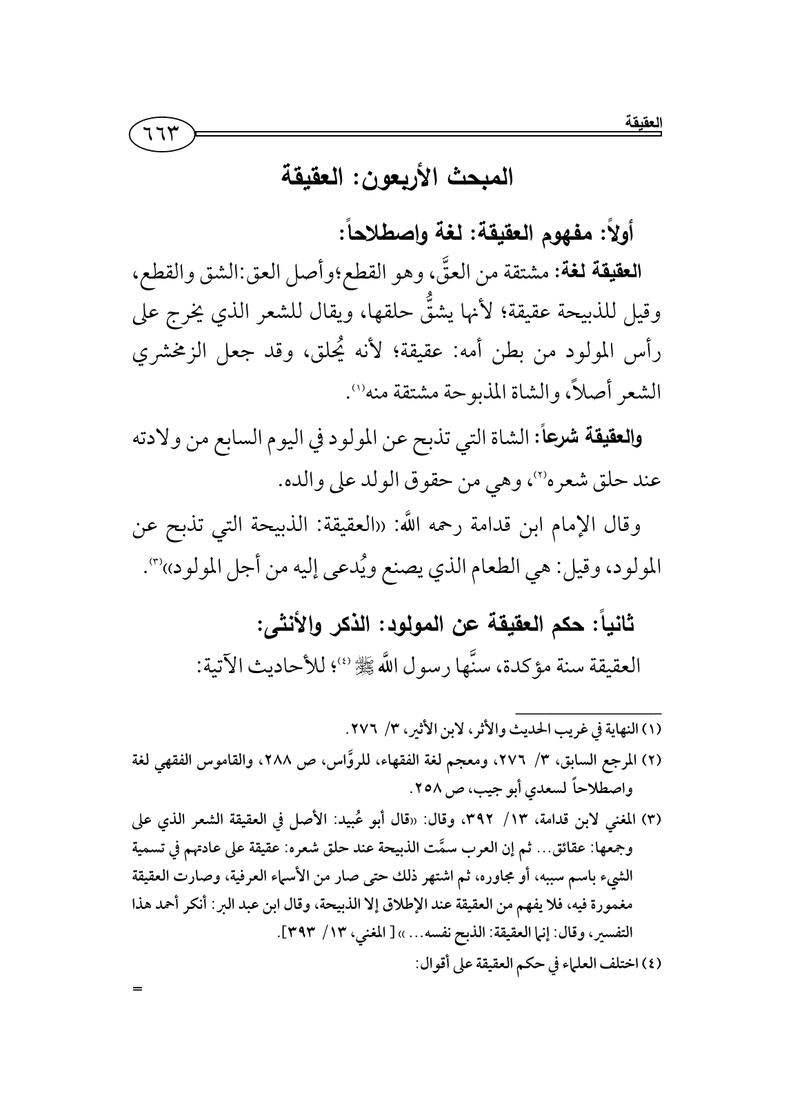 (¬3) المغني لابن قدامة، 13/ 392، وقال: ((قال أبو عُبيد: الأصل في العقيقة الشعر الذي على المولود، وجمعها: عقائق ... ثم إن العرب سمَّت الذبيحة عند حلق شعره: عقيقة على عادتهم في تسمية الشيء باسم سببه، أو مجاوره، ثم اشتهر ذلك حتى صار من الأسماء العرفية، وصارت العقيقة مغمورة فيه، فلا يفهم من العقيقة عند الإطلاق إلا الذبيحة، وقال ابن عبد البر: أنكر أحمد هذا التفسير، وقال: إنما العقيقة: الذبح نفسه ... )) [المغني، 13/ 393].