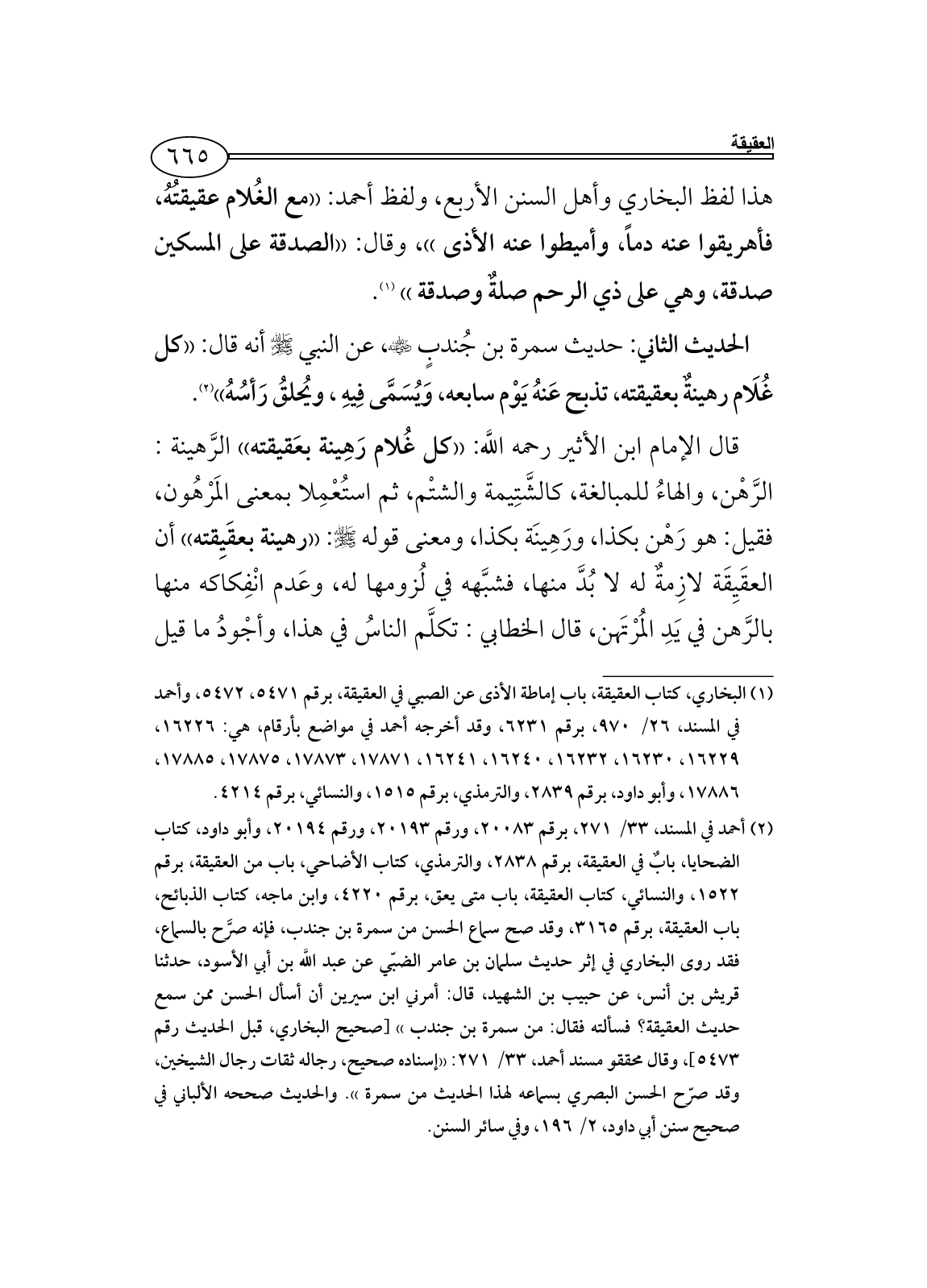 الحديث الثاني: حديث سمرة بن جُندبٍ - رضي الله عنه -، عن النبي - صلى الله عليه وسلم - أنه قال: ((كل غُلَام رهينةٌ بعقيقته، تذبح عَنهُ يَوْم سابعه، وَيُسَمَّى فِيهِ، ويُحلقُ رَأسُهُ)) (¬2).