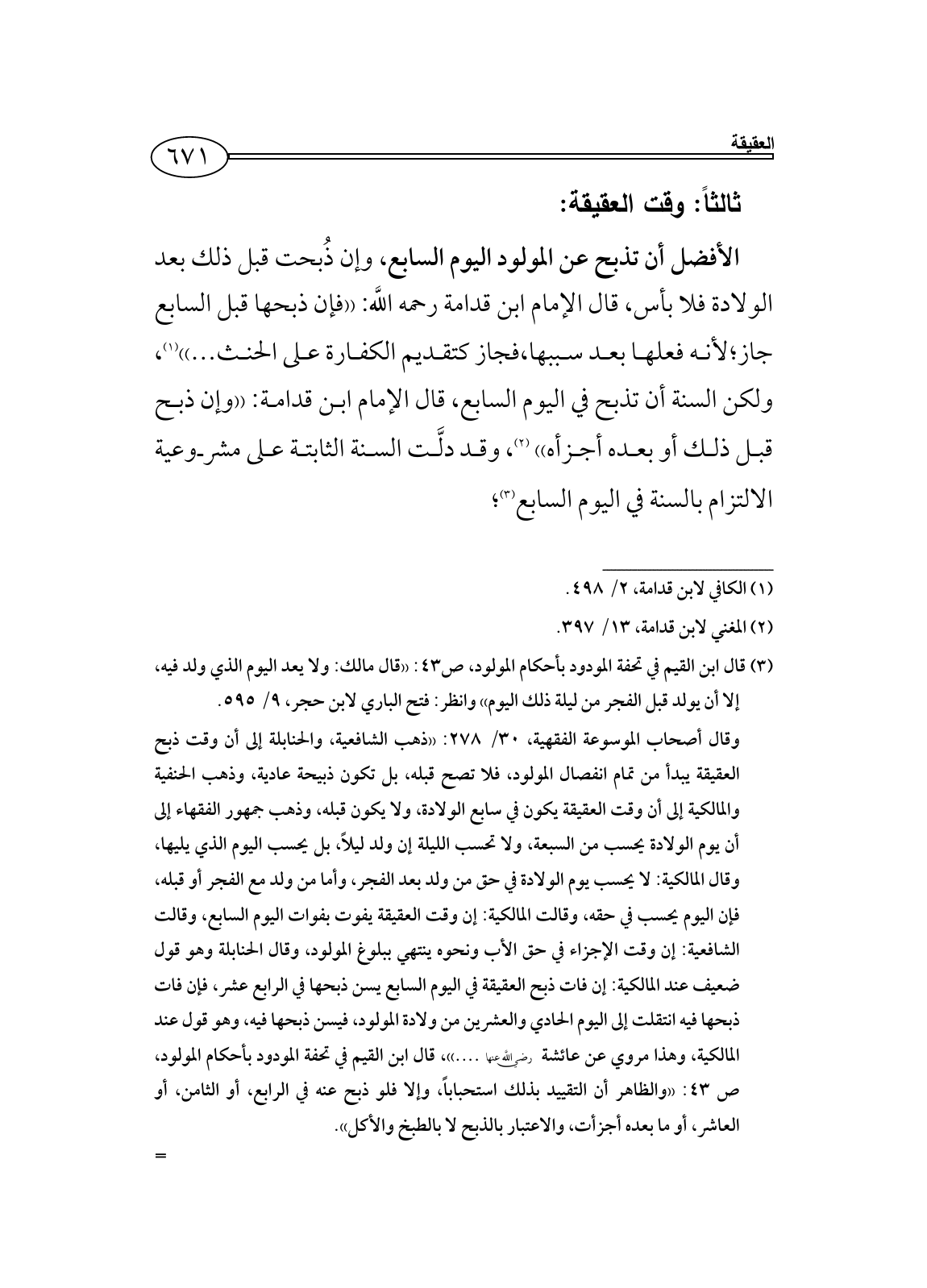 وقال أصحاب الموسوعة الفقهية، 30/ 278: ((ذهب الشافعية، والحنابلة إلى أن وقت ذبح العقيقة يبدأ من تمام انفصال المولود، فلا تصح قبله، بل تكون ذبيحة عادية، وذهب الحنفية والمالكية إلى أن وقت العقيقة يكون في سابع الولادة، ولا يكون قبله، وذهب جمهور الفقهاء إلى أن يوم الولادة يحسب من السبعة، ولا تحسب الليلة إن ولد ليلاً، بل يحسب اليوم الذي يليها، وقال المالكية: لا يحسب يوم الولادة في حق من ولد بعد الفجر، وأما من ولد مع الفجر أو قبله، فإن اليوم يحسب في حقه، وقالت المالكية: إن وقت العقيقة يفوت بفوات اليوم السابع، وقالت الشافعية: إن وقت الإجزاء في حق الأب ونحوه ينتهي ببلوغ المولود، وقال الحنابلة وهو قول ضعيف عند المالكية: إن فات ذبح العقيقة في اليوم السابع يسن ذبحها في الرابع عشر، فإن فات ذبحها فيه انتقلت إلى اليوم الحادي والعشرين من ولادة المولود، فيسن ذبحها فيه، وهو قول عند المالكية، وهذا مروي عن عائشة رضي اللَّه عنها .... ))، قال ابن القيم في تحفة المودود بأحكام المولود، ص 43: ((والظاهر أن التقييد بذلك استحباباً، وإلا فلو ذبح عنه في الرابع، أو الثامن، أو العاشر، أو ما بعده أجزأت، والاعتبار بالذبح لا بالطبخ والأكل)).