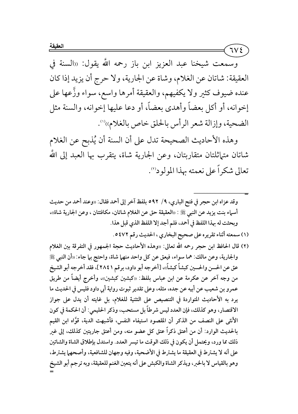 وهذه الأحاديث الصحيحة تدل على أن السنة أن يُذبح عن الغلام شاتان متماثلتان متقاربتان، وعن الجارية شاة، يتقرب بها العبد إلى اللَّه تعالى شكراً على نعمته بهذا المولود (¬2).