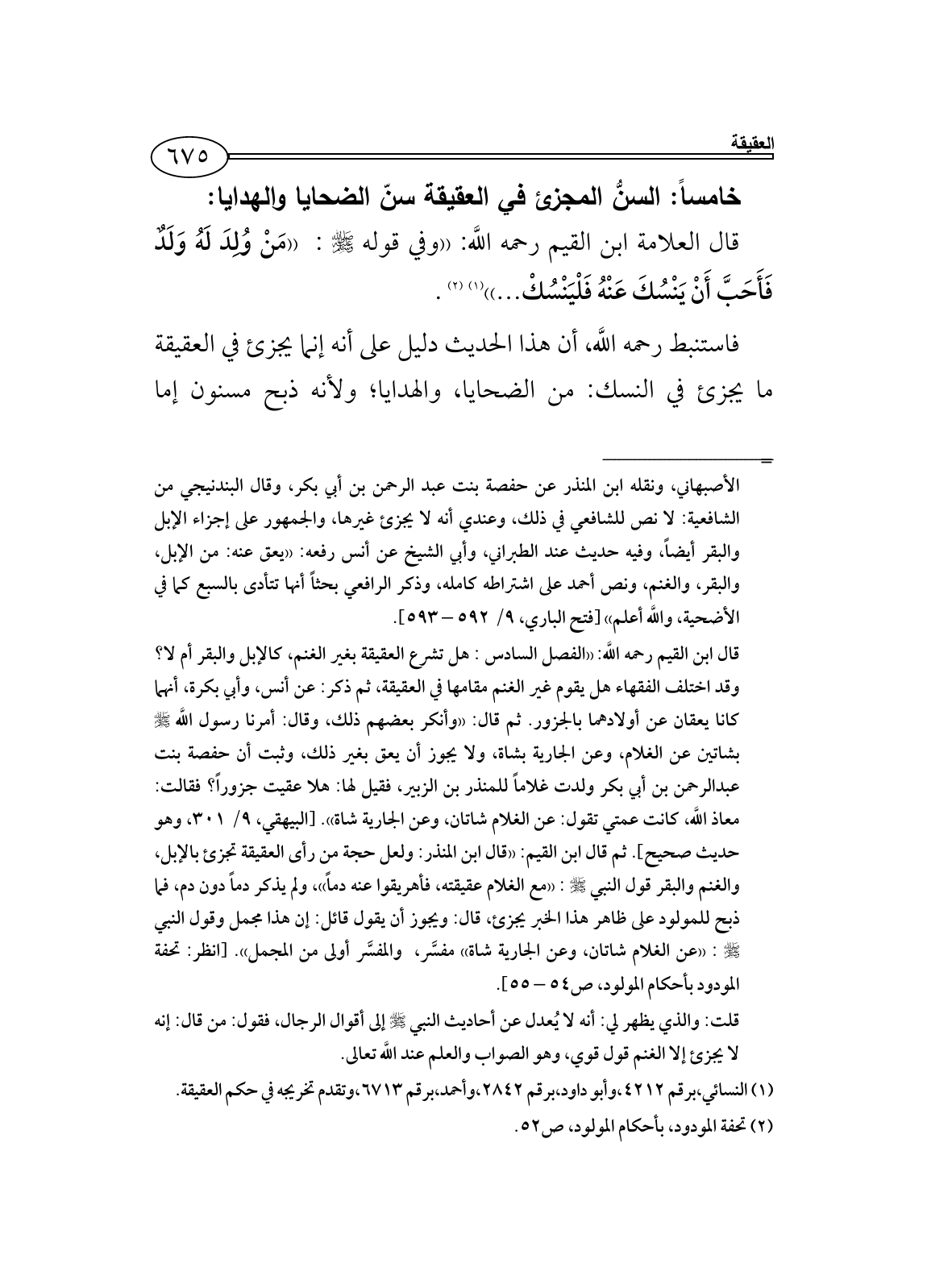 قال العلامة ابن القيم رحمه اللَّه: ((وفي قوله - صلى الله عليه وسلم -: ((مَنْ وُلِدَ لَهُ وَلَدٌ فَأَحَبَّ أَنْ يَنْسُكَ عَنْهُ فَلْيَنْسُكْ ... )) (¬1) (¬2).
