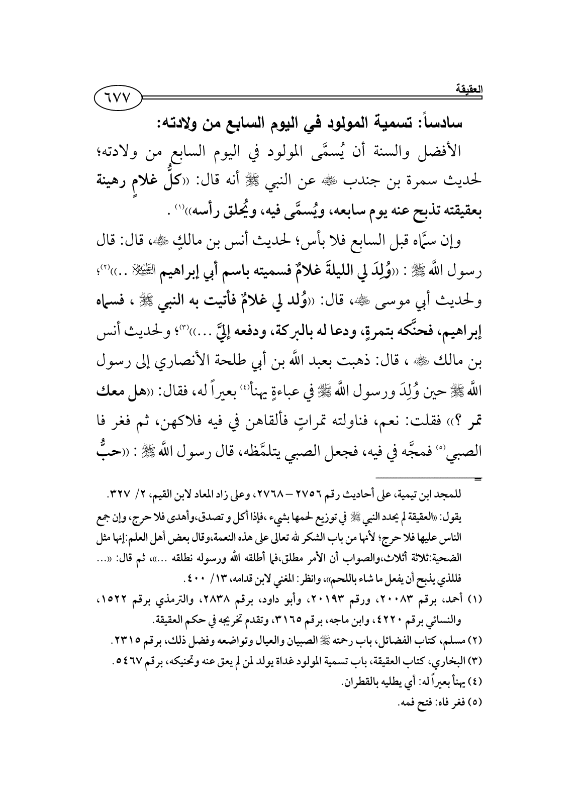 ولحديث أبي موسى - رضي الله عنه -، قال: ((وُلد لي غلامٌ فأتيت به النبي - صلى الله عليه وسلم -، فسماه إبراهيم، فحنَّكه بتمرةٍ، ودعا له بالبركة، ودفعه إليَّ ... )) (¬3)؛ ولحديث أنس بن مالك - رضي الله عنه -، قال: ذهبت بعبد اللَّه بن أبي طلحة الأنصاري إلى رسول اللَّه - صلى الله عليه وسلم - حين وُلِدَ ورسول اللَّه - صلى الله عليه وسلم - في عباءةٍ يهنأ (¬4) بعيراً له، فقال: ((هل معك تمر؟)) فقلت: نعم، فناولته تمراتٍ فألقاهن في فيه فلاكهن، ثم فغر فا الصبي (¬5) فمجَّه في فيه، فجعل الصبي يتلمَّظه، قال رسول اللَّه - صلى الله عليه وسلم -: ((حبُّ