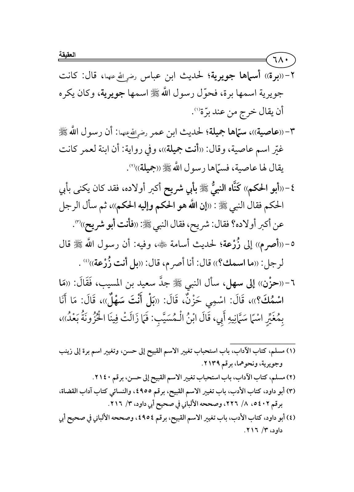 (¬4) أبو داود، كتاب الأدب، باب تغيير الاسم القبيح، برقم 4954، وصححه الألباني في صحيح أبي داود، 3/ 216.