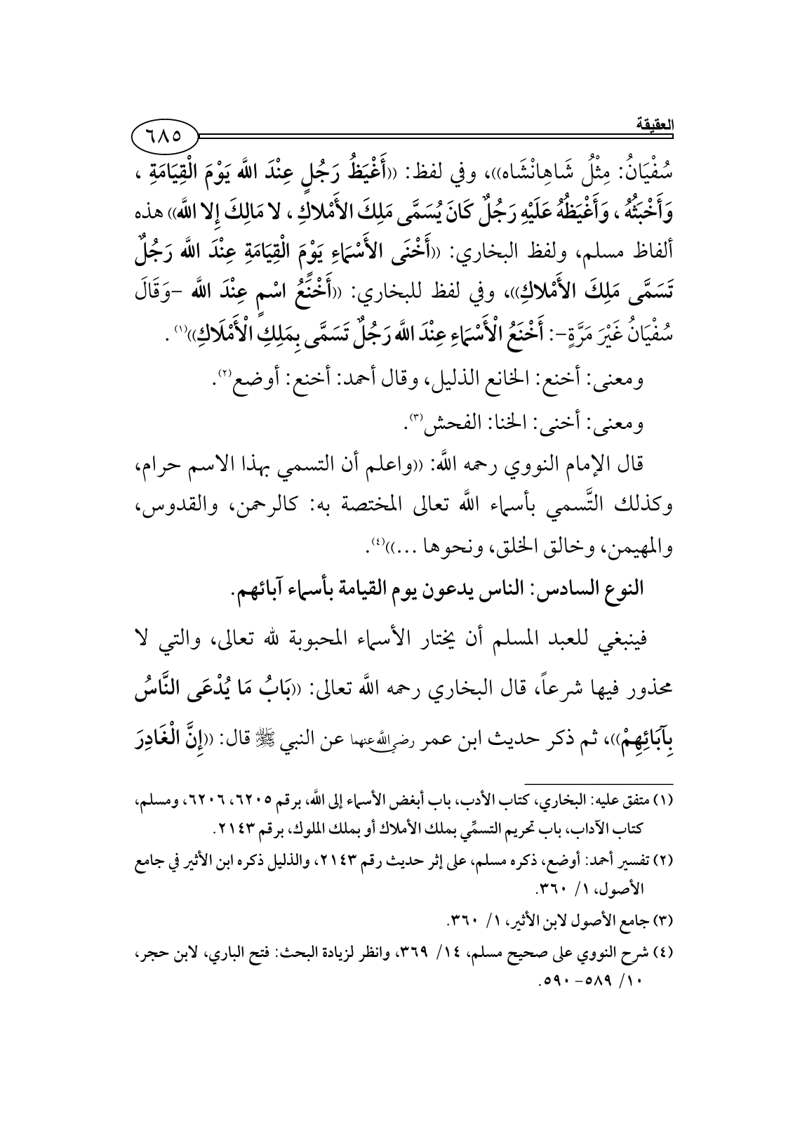 سُفْيَانُ: مِثْلُ شَاهِانْشَاه))، وفي لفظ: ((أَغْيَظُ رَجُلٍ عِنْدَ اللَّه يَوْمَ الْقِيَامَةِ، وَأَخْبَثُهُ، وَأَغْيَظُهُ عَلَيْهِ رَجُلٌ كَانَ يُسَمَّى مَلِكَ الأَمْلاكِ، لا مَالِكَ إِلا اللَّه)) هذه ألفاظ مسلم، ولفظ البخاري: ((أَخْنَى الأَسْمَاءِ يَوٍْمَ الْقِيَامَةِ عِنْدَ اللَّه رَجُلٌ تَسَمَّى مَلِكَ الأَمْلاكِ))، وفي لفظ للبخاري: ((أَخْنَعُ اسْمٍ عِنْدَ اللَّه -وَقَالَ سُفْيَانُ غَيْرَ مَرَّةٍ-: أَخْنَعُ الْأَسْمَاءِ عِنْدَ اللَّه رَجُلٌ تَسَمَّى بِمَلِكِ الْأَمْلَاكِ)) (¬1).