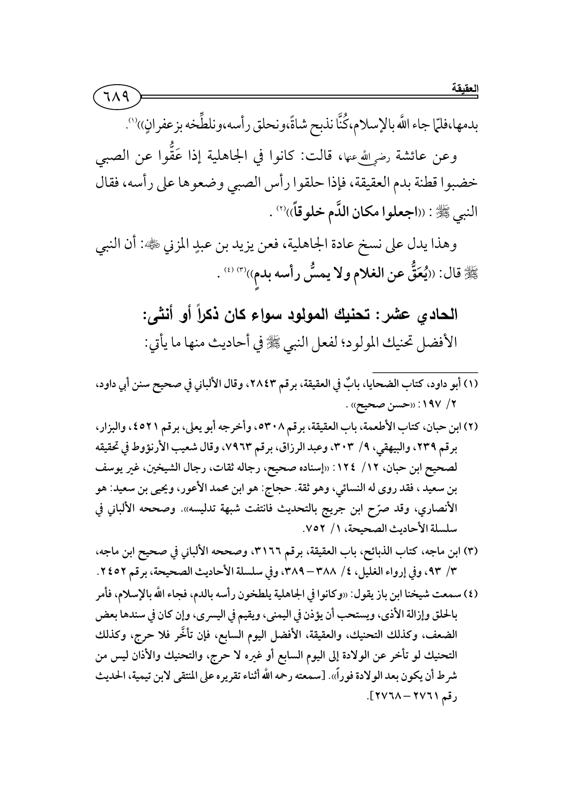 (¬4) سمعت شيخنا ابن باز يقول: ((وكانوا في الجاهلية يلطخون رأسه بالدم، فجاء اللَّه بالإسلام، فأمر بالحلق وإزالة الأذى، ويستحب أن يؤذن في اليمنى، ويقيم في اليسرى، وإن كان في سندها بعض الضعف، وكذلك التحنيك، والعقيقة، الأفضل اليوم السابع، فإن تأخَّر فلا حرج، وكذلك التحنيك لو تأخر عن الولادة إلى اليوم السابع أو غيره لا حرج، والتحنيك والأذان ليس من شرط أن يكون بعد الولادة فوراً)). [سمعته رحمه اللَّه أثناء تقريره على المنتقى لابن تيمية، الحديث رقم 2761 - 2768].