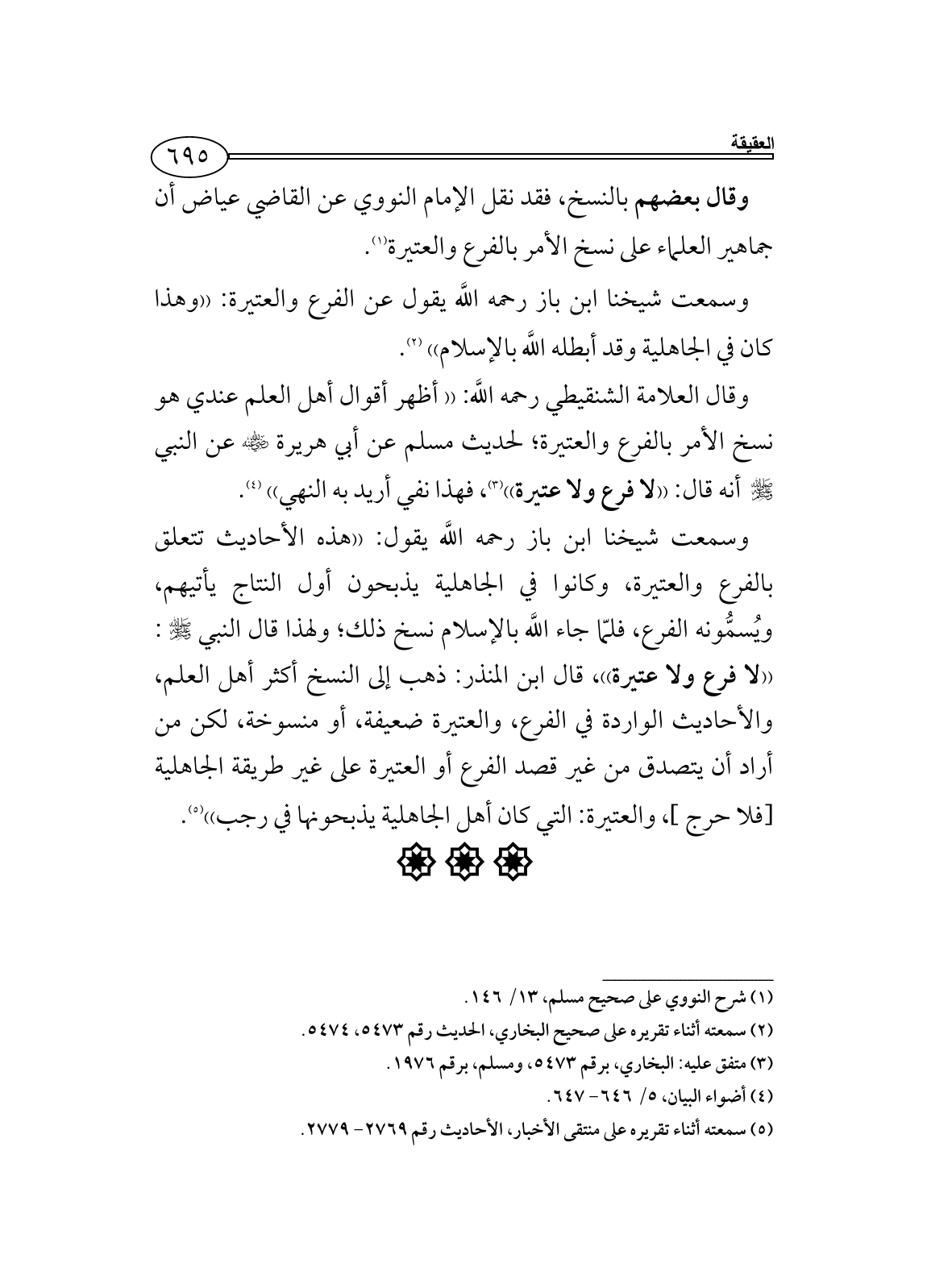 وسمعت شيخنا ابن باز رحمه اللَّه يقول عن الفرع والعتيرة: ((وهذا كان في الجاهلية وقد أبطله اللَّه بالإسلام)) (¬2).