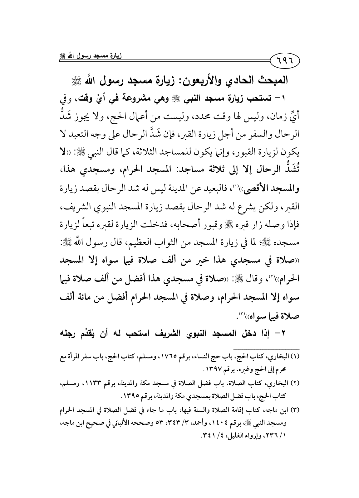 1 - تستحب زيارة مسجد النبي - صلى الله عليه وسلم - وهي مشروعة في أيِّ وقت، وفي أيِّ زمان، وليس لها وقت محدد، وليست من أعمال الحج، ولا يجوز شَدُّ الرحال والسفر من أجل زيارة القبر، فإن شَدَّ الرحال على وجه التعبد لا يكون لزيارة القبور، وإنما يكون للمساجد الثلاثة، كما قال النبي - صلى الله عليه وسلم -: ((لا تُشَدُّ الرحال إلا إلى ثلاثة مساجد: المسجد الحرام، ومسجدي هذا، والمسجد الأقصى)) (¬1)، فالبعيد عن المدينة ليس له شد الرحال بقصد زيارة القبر، ولكن يشرع له شد الرحال بقصد زيارة المسجد النبوي الشريف، فإذا وصله زار قبره - صلى الله عليه وسلم - وقبور أصحابه، فدخلت الزيارة لقبره تبعاً لزيارة مسجده - صلى الله عليه وسلم -؛ لما في زيارة المسجد من الثواب العظيم، قال رسول اللَّه - صلى الله عليه وسلم -: ((صلاة في مسجدي هذا خير من ألف صلاة فيما سواه إلا المسجد الحرام)) (¬2)، وقال - صلى الله عليه وسلم -: ((صلاة في مسجدي هذا أفضل من ألف صلاة فيما سواه إلا المسجد الحرام، وصلاة في المسجد الحرام أفضل من مائة ألف صلاة فيما سواه)) (¬3).