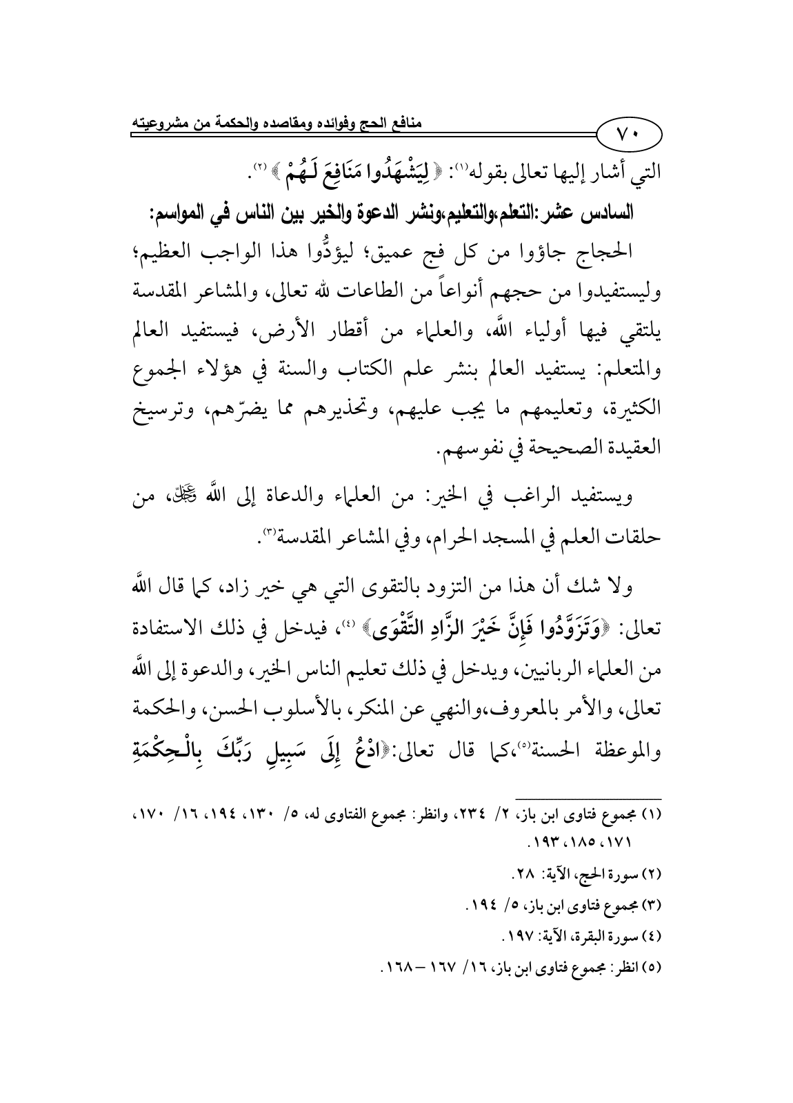 الحجاج جاؤوا من كل فج عميق؛ ليؤدُّوا هذا الواجب العظيم؛ وليستفيدوا من حجهم أنواعاً من الطاعات لله تعالى، والمشاعر المقدسة يلتقي فيها أولياء اللَّه، والعلماء من أقطار الأرض، فيستفيد العالم والمتعلم: يستفيد العالم بنشر علم الكتاب والسنة في هؤلاء الجموع الكثيرة، وتعليمهم ما يجب عليهم، وتحذيرهم مما يضرّهم، وترسيخ العقيدة الصحيحة في نفوسهم.