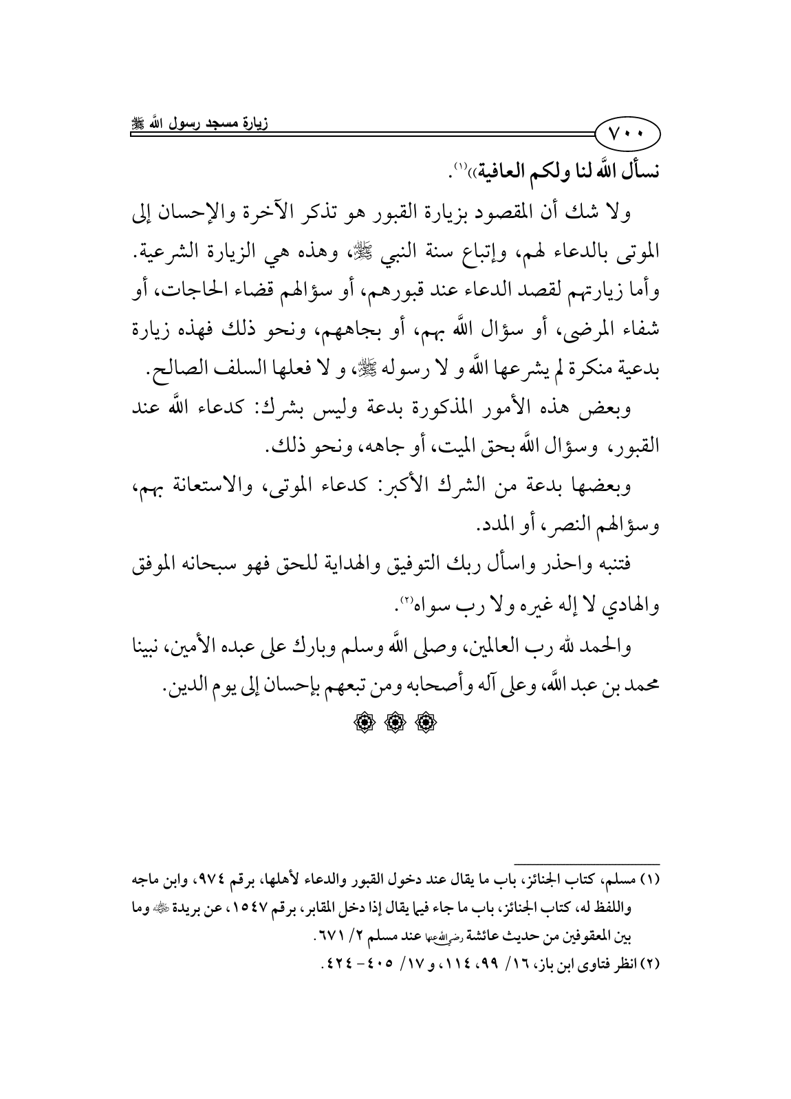 (¬1) مسلم، كتاب الجنائز، باب ما يقال عند دخول القبور والدعاء لأهلها، برقم 974، وابن ماجه واللفظ له، كتاب الجنائز، باب ما جاء فيما يقال إذا دخل المقابر، برقم 1547، عن بريدة - رضي الله عنه - وما بين المعقوفين من حديث عائشة رضي اللَّه عنها عند مسلم 2/ 671.