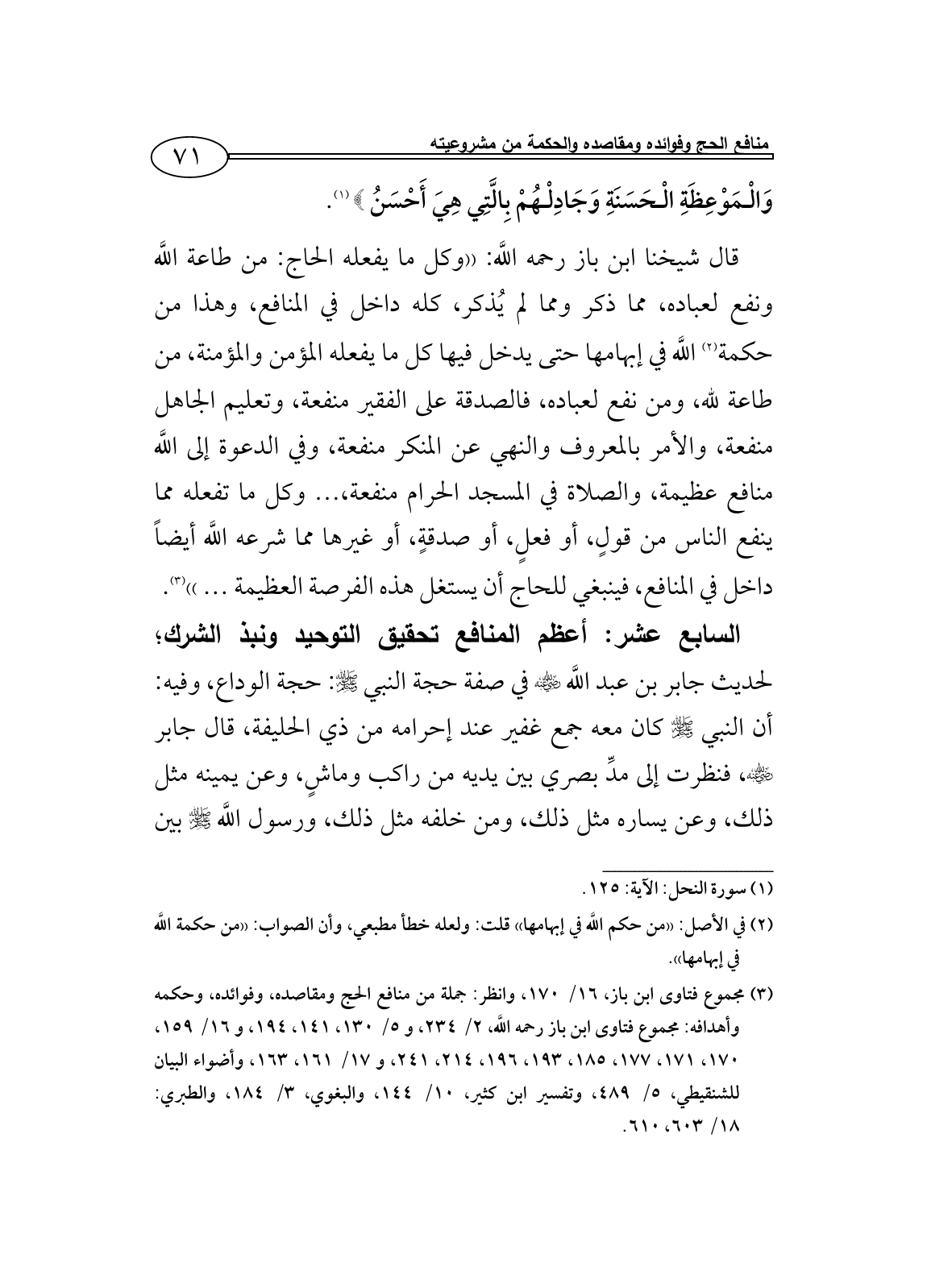(¬3) مجموع فتاوى ابن باز، 16/ 170، وانظر: جملة من منافع الحج ومقاصده، وفوائده، وحكمه وأهدافه: مجموع فتاوى ابن باز رحمه اللَّه، 2/ 234، و 5/ 130، 141، 194، و 16/ 159، 170، 171، 177، 185، 193، 196، 214، 241، و 17/ 161، 163، وأضواء البيان للشنقيطي، 5/ 489، وتفسير ابن كثير، 10/ 144، والبغوي، 3/ 184، والطبري: