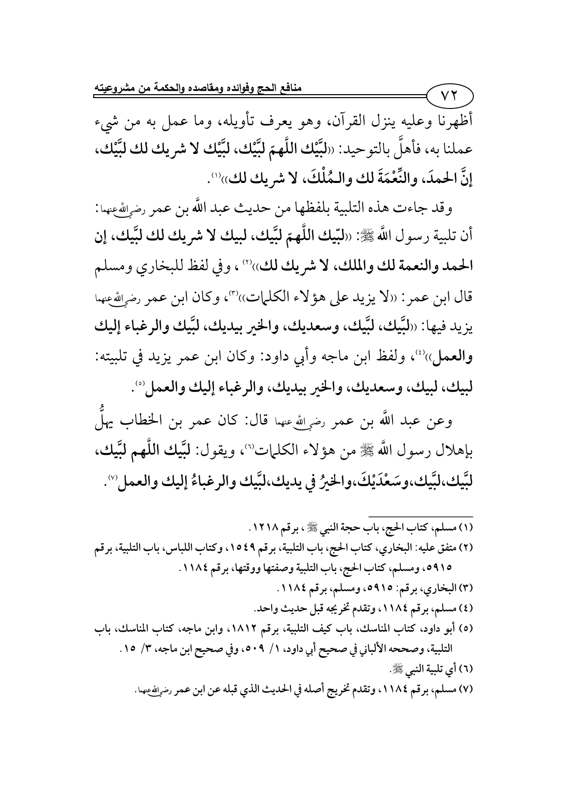(¬5) أبو داود، كتاب المناسك، باب كيف التلبية، برقم 1812، وابن ماجه، كتاب المناسك، باب التلبية، وصححه الألباني في صحيح أبي داود، 1/ 509، وفي صحيح ابن ماجه، 3/ 15.