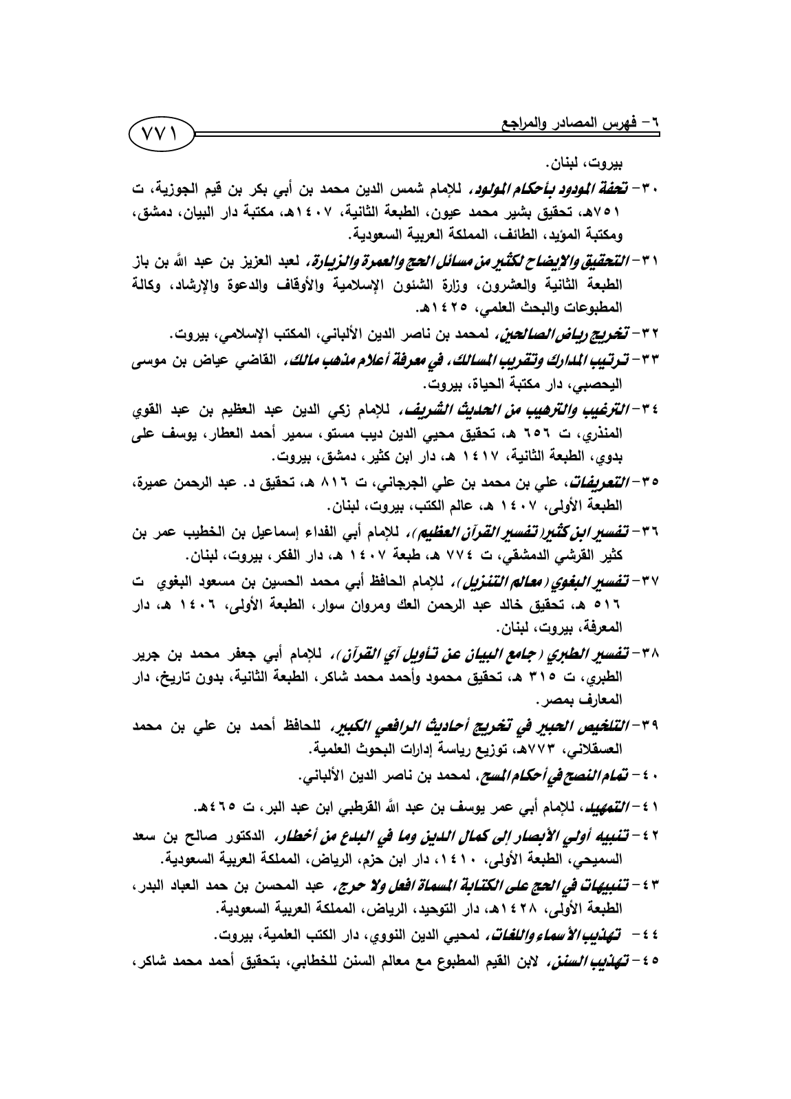 30 - تحفة المودود بأحكام المولود، للإمام شمس الدين محمد بن أبي بكر بن قيم الجوزية، ت 751هـ، تحقيق بشير محمد عيون، الطبعة الثانية، 1407هـ، مكتبة دار البيان، دمشق، ومكتبة المؤيد، الطائف، المملكة العربية السعودية.