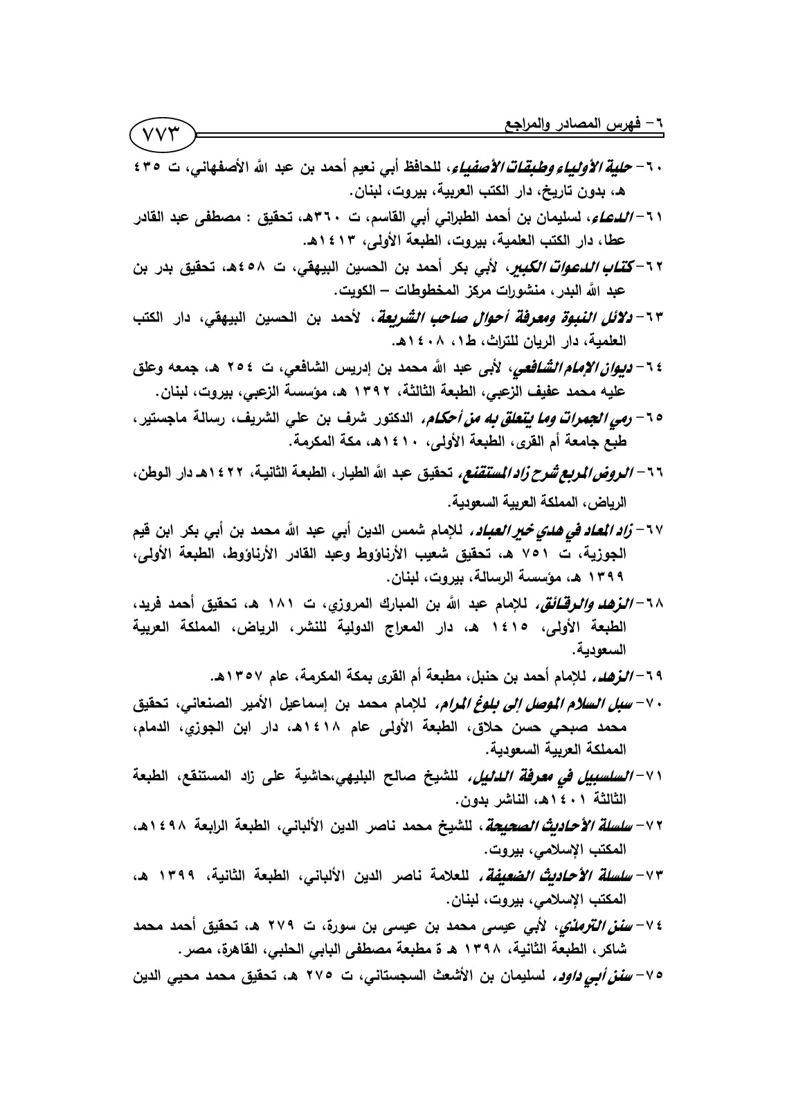 67 - زاد المعاد في هدي خير العباد، للإمام شمس الدين أبي عبد اللَّه محمد بن أبي بكر ابن قيم الجوزية، ت 751 هـ، تحقيق شعيب الأرناؤوط وعبد القادر الأرناؤوط، الطبعة الأولى، 1399 هـ، مؤسسة الرسالة، بيروت، لبنان.