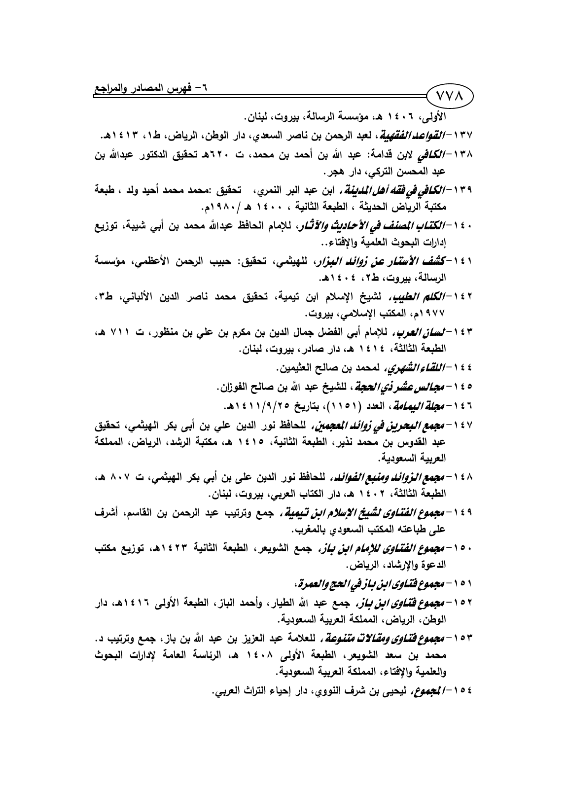 137 - القواعد الفقهية، لعبد الرحمن بن ناصر السعدي، دار الوطن، الرياض، ط1، 1413هـ.