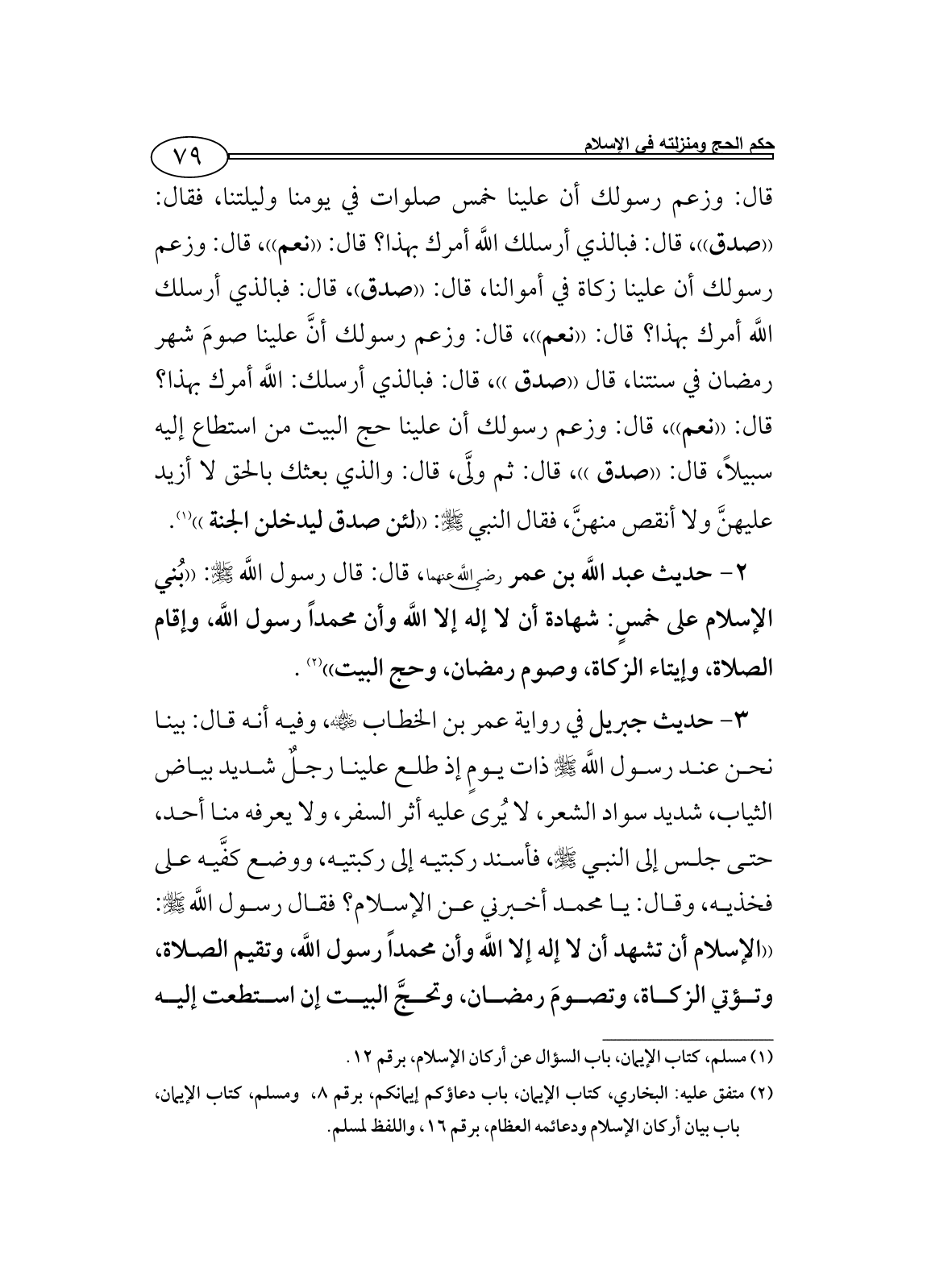 (¬2) متفق عليه: البخاري، كتاب الإيمان، باب دعاؤكم إيمانكم، برقم 8، ومسلم، كتاب الإيمان، باب بيان أركان الإسلام ودعائمه العظام، برقم 16، واللفظ لمسلم.