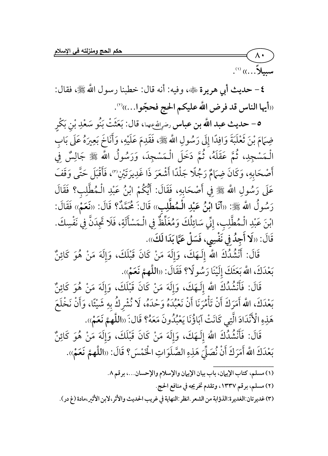 4 - حديث أبي هريرة - رضي الله عنه -، وفيه: أنه قال: خطبنا رسول اللَّه - صلى الله عليه وسلم -، فقال: ((أيها الناس قد فرض اللَّه عليكم الحج فحجّوا ... )) (¬2).
