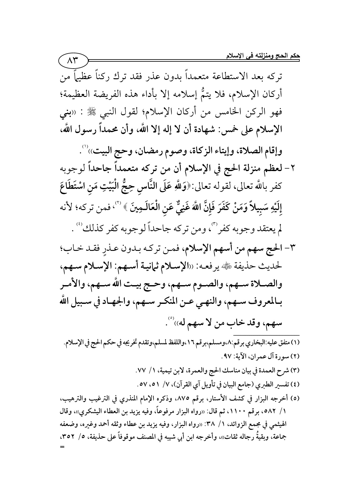 2 - لعظم منزلة الحج في الإسلام أن من تركه متعمداً جاحداً لوجوبه كفر باللَّه تعالى، لقوله تعالى: {وَللَّهِ عَلَى النَّاسِ حِجُّ الْبَيْتِ مَنِ اسْتَطَاعَ إِلَيْهِ سَبِيلاً وَمَنْ كَفَرَ فَإِنَّ اللَّهَ غَنِيٌّ عَنِ الْعَالَمِينَ} (¬2)، فمن تركه؛ لأنه لم يعتقد وجوبه كفر (¬3)، ومن تركه جاحداً لوجوبه كفر كذلك (¬4).