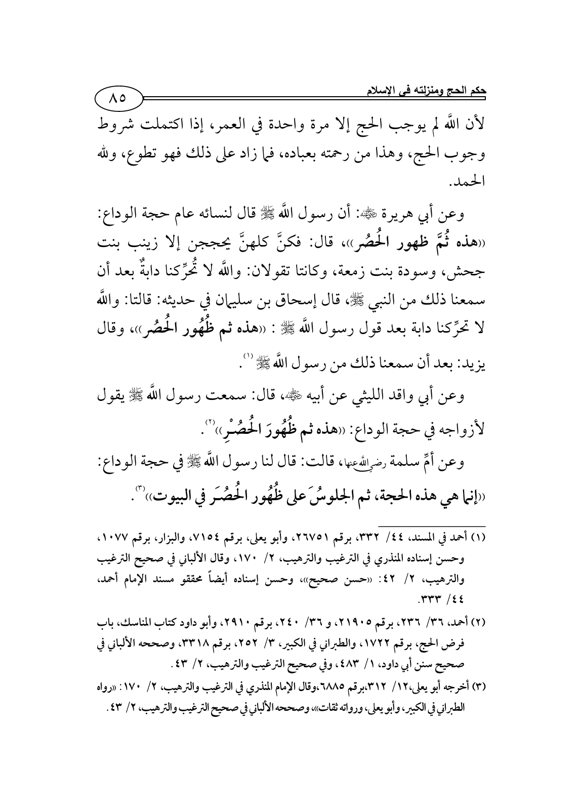(¬2) أحمد، 36/ 236، برقم 21905، و 36/ 240، برقم 2910، وأبو داود كتاب المناسك، باب فرض الحج، برقم 1722، والطبراني في الكبير، 3/ 252، برقم 3318، وصححه الألباني في صحيح سنن أبي داود، 1/ 483، وفي صحيح الترغيب والترهيب، 2/ 43.