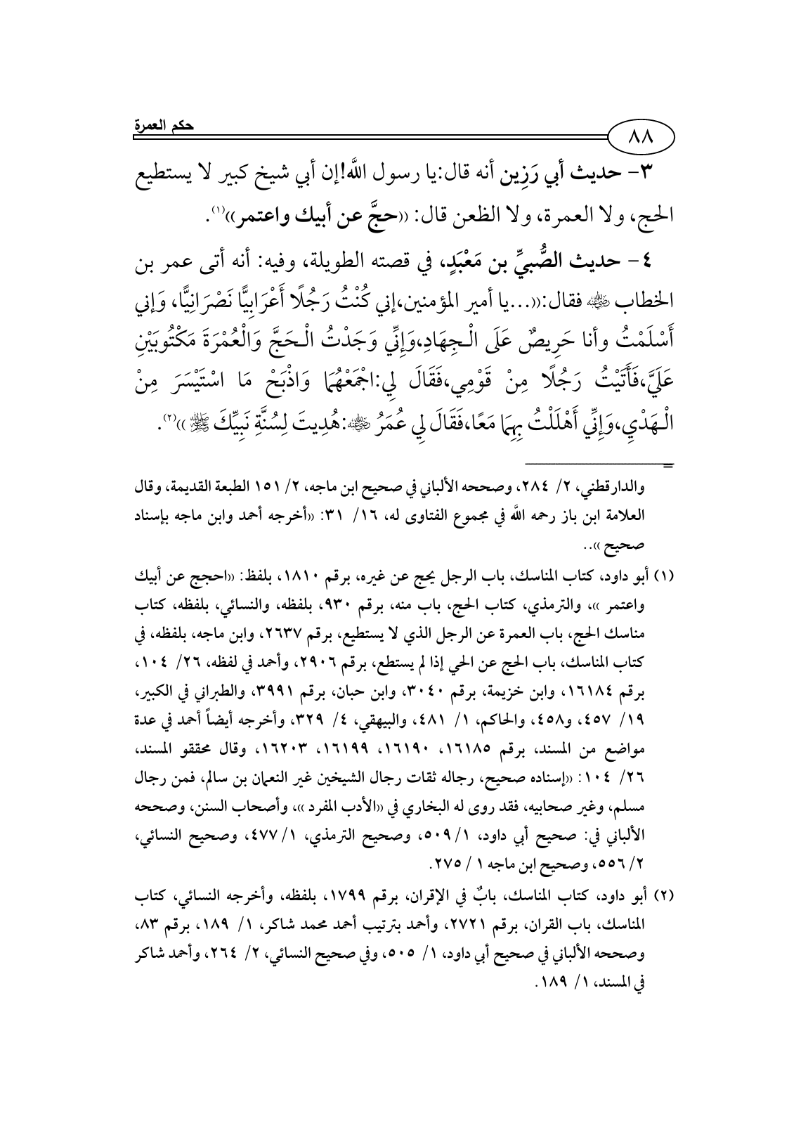 3 - حديث أبي رَزِين أنه قال: يا رسول اللَّه! إن أبي شيخ كبير لا يستطيع الحج، ولا العمرة، ولا الظعن قال: ((حجَّ عن أبيك واعتمر)) (¬1).
