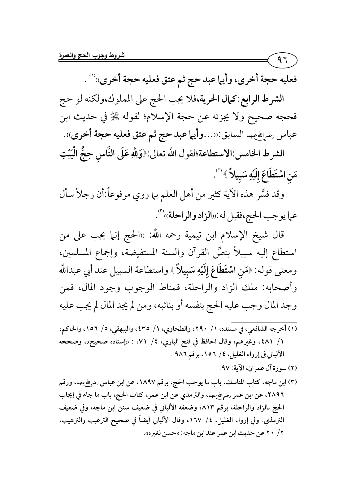 (¬3) ابن ماجه، كتاب المناسك، باب ما يوجب الحج، برقم 1897، عن ابن عباس رضي اللَّه عنهما، ورقم 2896، عن ابن عمر رضي اللَّه عنهما، والترمذي عن ابن عمر، كتاب الحج، باب ما جاء في إيجاب الحج بالزاد والراحلة، برقم 813، وضعفه الألباني في ضعيف سنن ابن ماجه، وفي ضعيف الترمذي. وفي إرواء الغليل، 4/ 167، وقال الألباني أيضاً في صحيح الترغيب والترهيب،