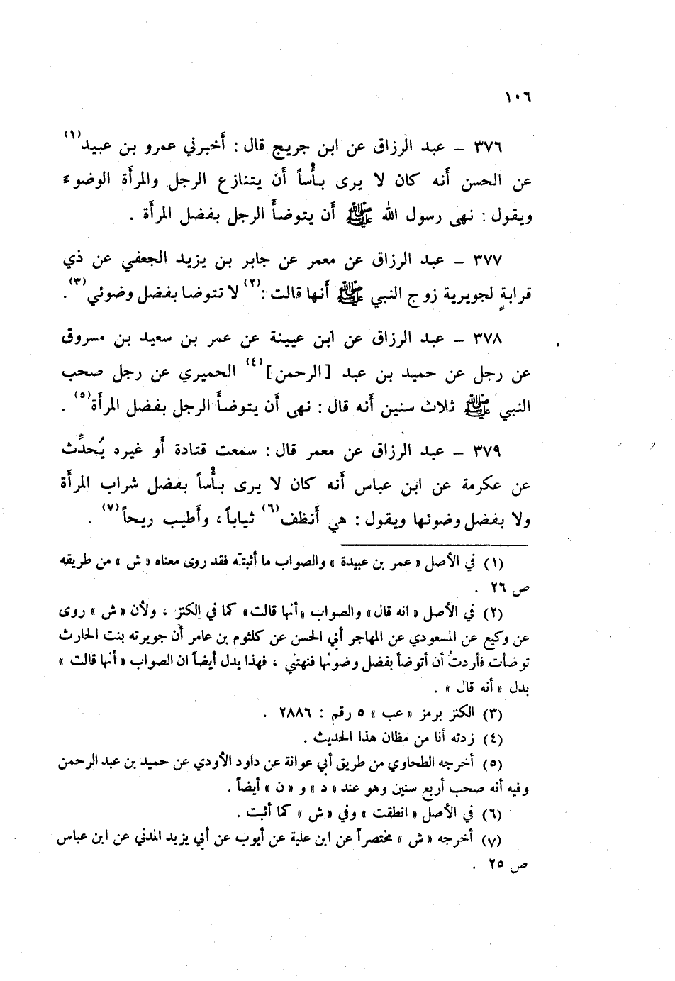 376 - عَبْدُ الرَّزَّاقِ عَنِ ابْنِ جُرَيْجٍ قَالَ: أَخْبَرَنِي عَمْرُو بْنُ عُبَيْدٍ، عَنِ الْحَسَنِ، أَنَّهُ كَانَ لَا يَرَى بَأْسًا أَنْ يَتَنَازَعَ الرَّجُلُ وَالْمَرْأَةُ الْوُضُوءَ وَيَقُولُ: «§نَهَى رَسُولُ اللَّهِ صَلَّى اللهُ عَلَيْهِ وَسَلَّمَ أَنْ يَتَوَضَّأَ الرَّجُلُ بِفَضْلِ الْمَرْأَةِ»