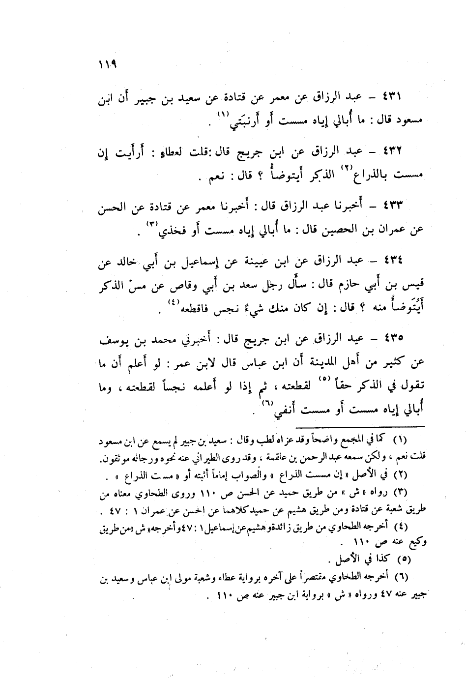 431 - عَبْدُ الرَّزَّاقِ عَنْ مَعْمَرٍ، عَنْ قَتَادَةَ، عَنْ سَعِيدِ بْنِ جُبَيْرٍ، أَنَّ ابْنَ مَسْعُودٍ قَالَ: «§مَا أُبَالِي إِيَّاهُ مَسَسْتُ أَوْ أَرْنَبَتِي»
