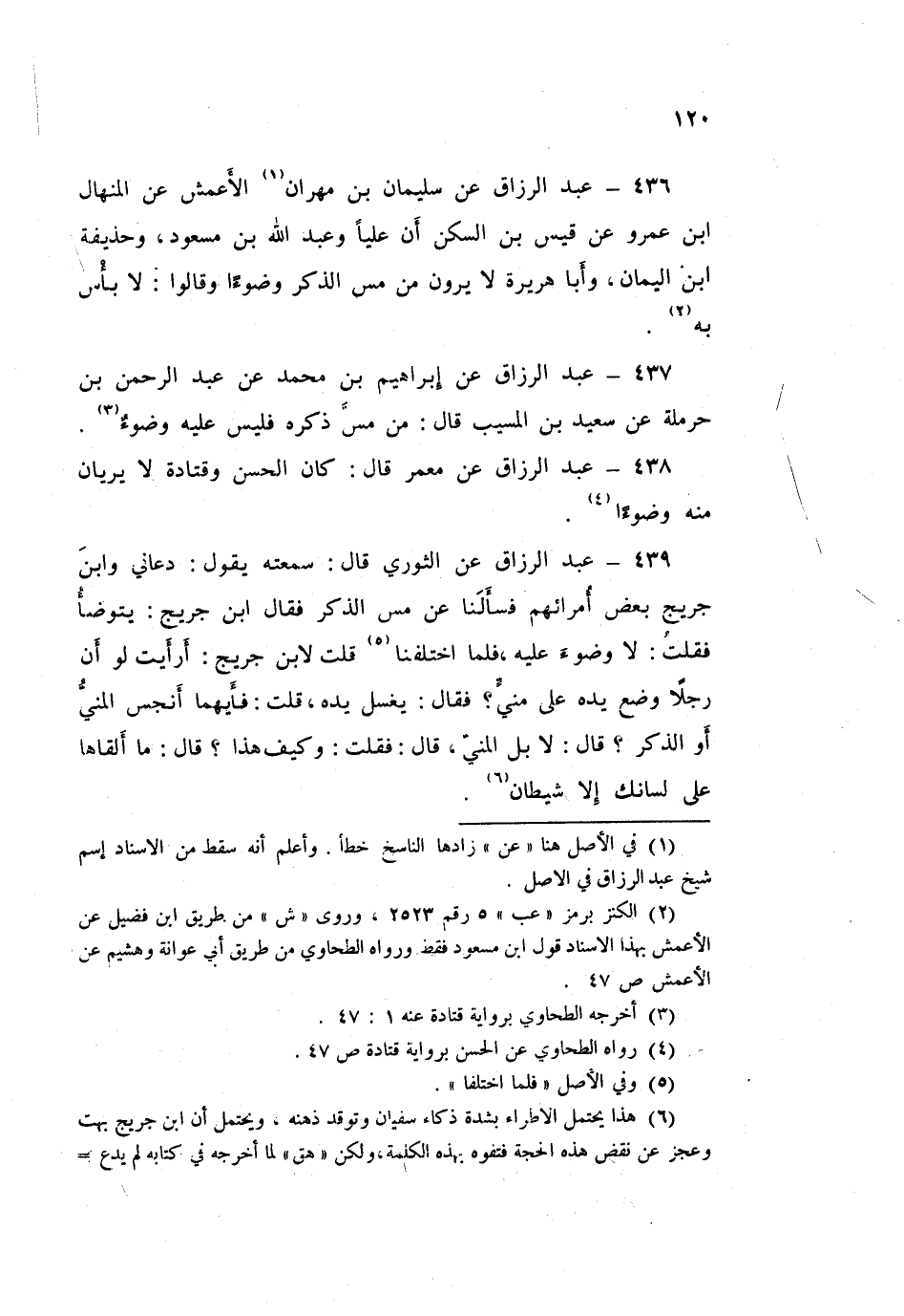 436 - عَبْدُ الرَّزَّاقِ، عَنْ سُلَيْمَانَ بْنِ مِهْرَانَ الْأَعْمَشِ، عَنِ الْمِنْهَالِ بْنِ عَمْرٍو، عَنْ قَيْسِ بْنِ السَّكَنِ، أَنَّ عَلِيًّا، وَعَبْدَ اللَّهِ بْنَ مَسْعُودٍ، وَحُذَيْفَةَ بْنَ الْيَمَانِ، وَأَبَا هُرَيْرَةَ §لَا يَرَوْنَ مِنْ مَسِّ الذَّكَرِ وُضُوءًا، وَقَالُوا: «لَا بَأْسَ بِهِ»