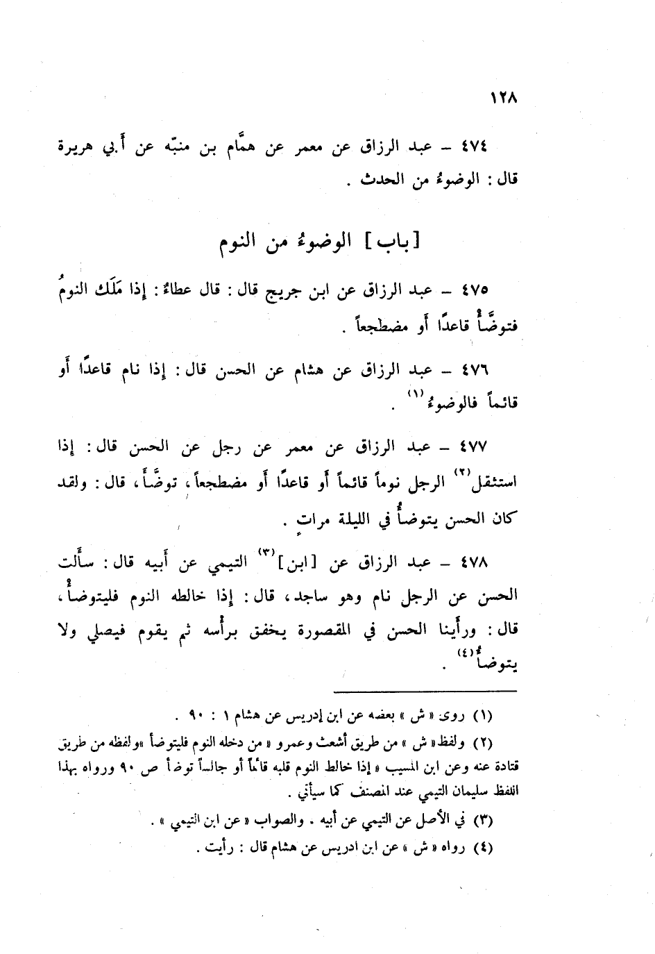 477 - عَبْدُ الرَّزَّاقِ، عَنْ مَعْمَرٍ، عَنْ رَجُلٍ، عَنِ الْحَسَنِ قَالَ: «§إِذَا اسْتَثْقَلَ الرَّجُلُ نَوْمًا قَائِمًا، أَوْ قَاعِدًا، أَوْ مُضْطَجِعًا تَوَضَّأَ». قَالَ: «وَلَقَدْ كَانَ الْحَسَنُ يَتَوَضَّأُ فِي اللَّيْلَةِ مَرَّاتٍ»