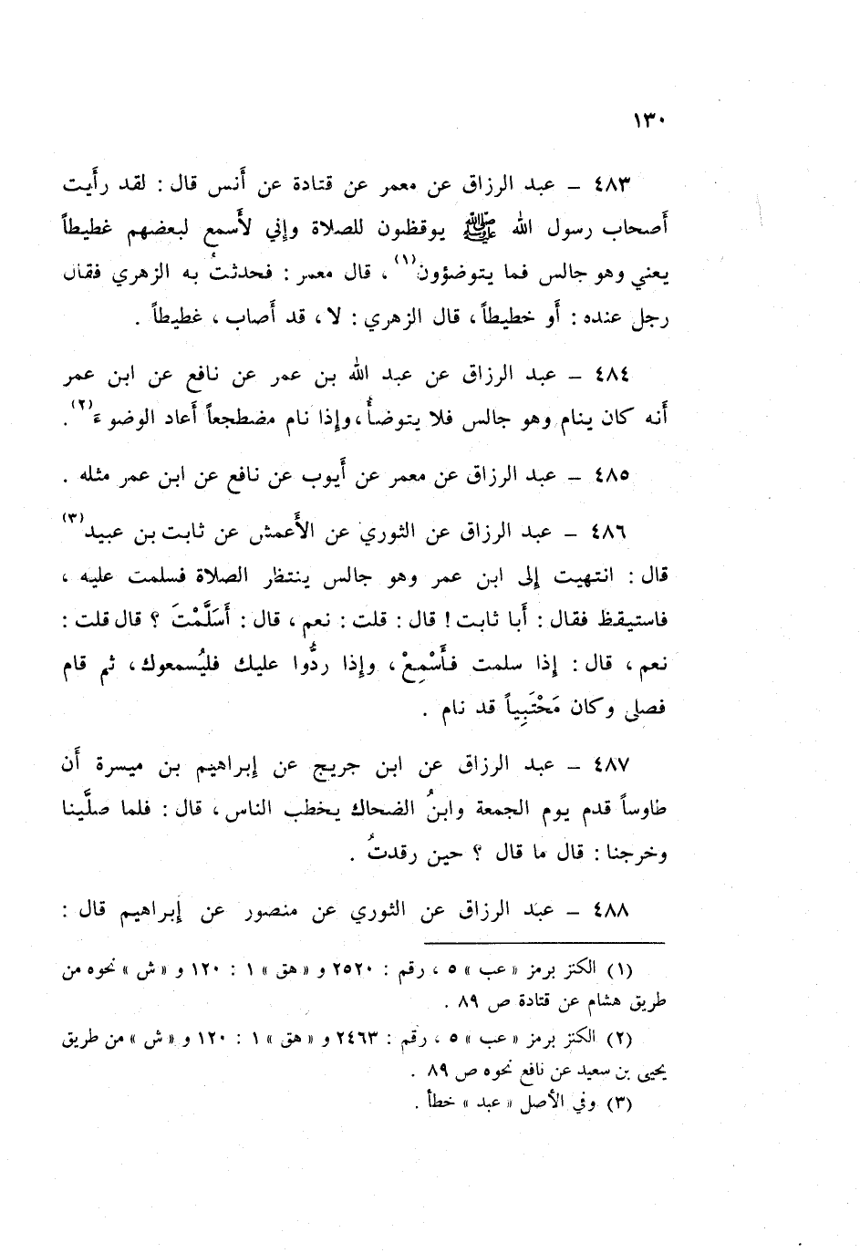 483 - عَبْدُ الرَّزَّاقِ، عَنْ مَعْمَرٍ، عَنْ قَتَادَةَ، عَنْ أَنَسٍ قَالَ: «لَقَدْ رَأَيْتُ أَصْحَابَ رَسُولِ اللَّهِ صَلَّى اللهُ عَلَيْهِ وَسَلَّمَ §يُوقَظُونَ لِلصَّلَاةِ، وَإِنِّي لَأَسْمَعُ لِبَعْضِهِمْ غَطِيطًا - يَعْنِي وَهُوَ جَالِسٌ - فَمَا يَتَوَضَّئُونَ». قَالَ مَعْمَرٌ: فَحَدَّثْتُ بِهِ الزُّهْرِيَّ، فَقَالَ رَجُلٌ عِنْدَهُ: أَوْ خَطِيطًا، قَالَ الزُّهْرِيُّ: «لَا، قَدْ أَصَابَ غَطِيطًا»