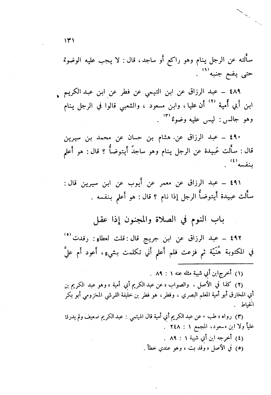 490 - عَبْدُ الرَّزَّاقِ، عَنْ هِشَامِ بْنِ حَسَّانَ، عَنْ مُحَمَّدِ بْنِ سِيرِينَ قَالَ: سَأَلْتُ عُبَيْدَةَ، عَنِ §الرَّجُلِ يَنَامُ وَهُوَ سَاجِدٌ أيَتَوَضَّأُ؟ قَالَ: «هُوَ أَعْلَمُ بِنَفْسِهِ»