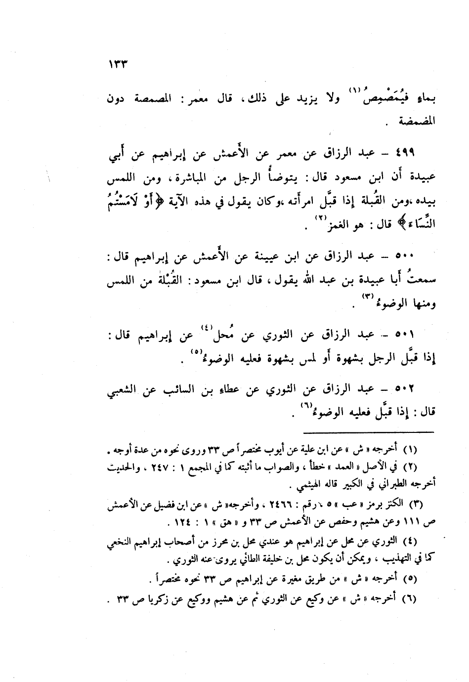 501 - عَبْدُ الرَّزَّاقِ، عَنِ الثَّوْرِيِّ، عَنْ مُحِلٍّ، عَنْ إِبْرَاهِيمَ قَالَ: «§إِذَا قَبَّلَ الرَّجُلُ بِشَهْوَةٍ، أَوْ لَمَسَ بِشَهْوَةٍ فَعَلَيْهِ الْوُضُوءُ»