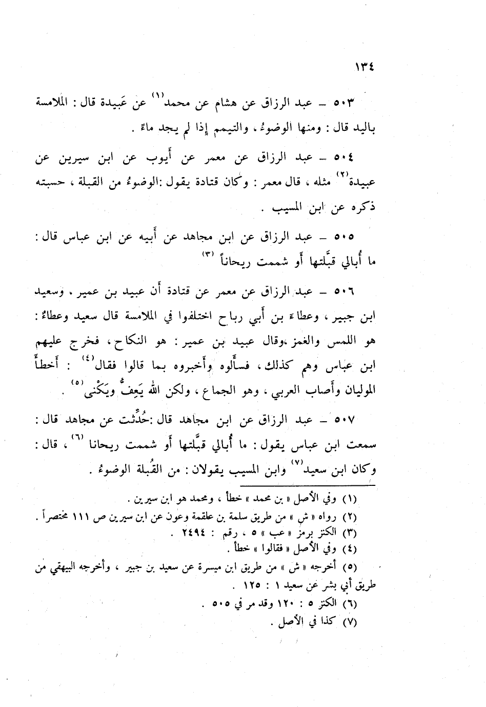 503 - عَبْدُ الرَّزَّاقِ، عَنْ هِشَامٍ، عَنْ مُحَمَّدٍ، عَنْ عَبِيْدَةَ قَالَ: «§الْمُلَامَسَةُ بِالْيَدِ» قَالَ: «وَمِنْهَا الْوُضُوءُ وَالتَّيَمُّمُ إِذَا لَمْ يَجِدْ مَاءً»،