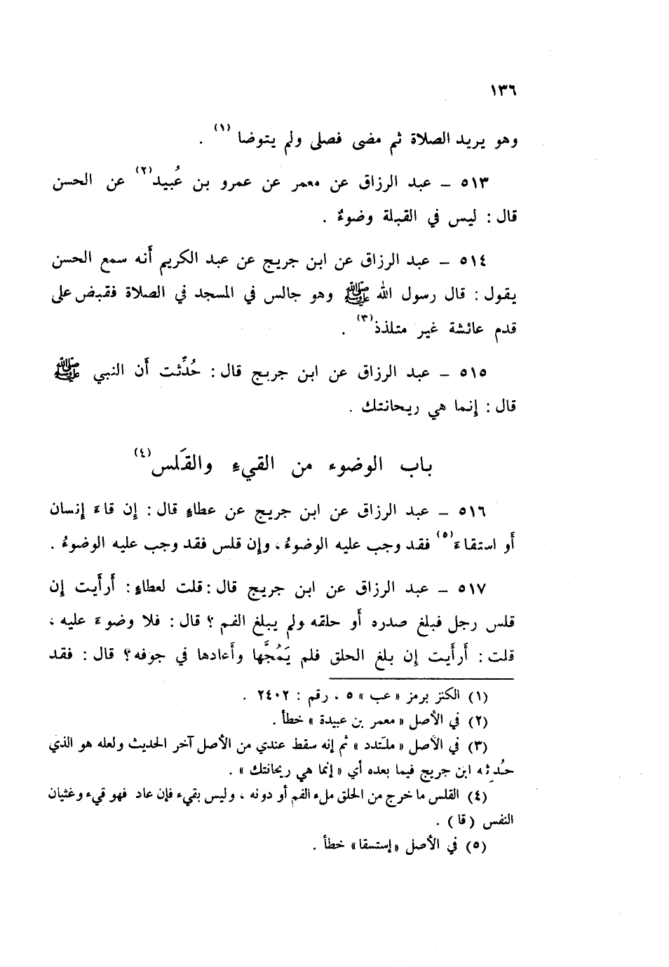 516 - عَبْدُ الرَّزَّاقِ، عَنِ ابْنِ جُرَيْجٍ، عَنْ عَطَاءٍ قَالَ: «§إِنْ قَاءَ إِنْسَانٌ أوِ اسْتَقَاءَ، فَقَدْ وَجَبَ عَلَيْهِ الْوُضُوءُ، وَإِنْ قَلَسَ فَقَدْ وَجَبَ عَلَيْهِ الْوُضُوءُ»