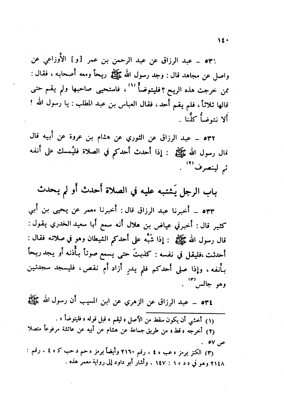 534 - عَبْدُ الرَّزَّاقِ، عَنِ الزُّهْرِيِّ، عَنِ ابْنِ الْمُسَيِّبِ، أَنَّ رَسُولَ اللَّهِ صَلَّى اللهُ عَلَيْهِ وَسَلَّمَ، سُئِلَ عَنِ الرَّجُلِ يَشْتَبِهُ فِي صَلَاتِهِ قَالَ: «§لَا يَنْصَرِفُ إِلَّا أَنْ يَجِدَ رِيحًا، أَوْ يَسْمَعَ صَوْتًا»