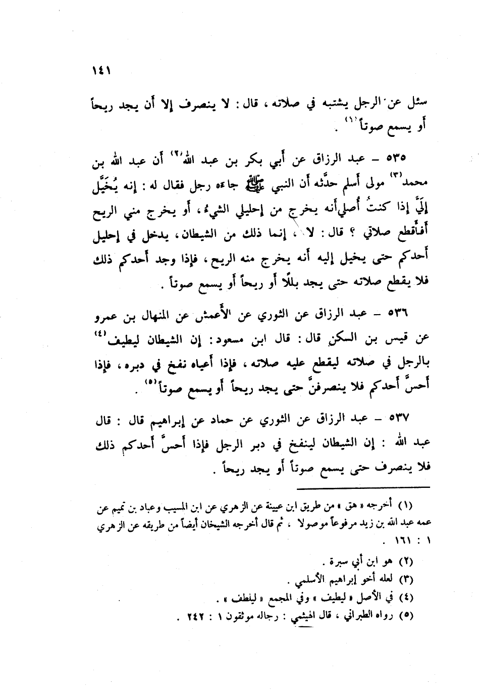 537 - عَبْدُ الرَّزَّاقِ، عَنِ الثَّوْرِيِّ، عَنْ حَمَّادٍ، عَنْ إِبْرَاهِيمَ قَالَ: قَالَ عَبْدُ اللَّهِ: «إِنَّ §الشَّيْطَانَ لَيَنْفُخُ فِي دُبُرِ الرَّجُلِ، فَإِذَا أَحَسَّ أَحَدُكُمْ ذَلِكَ فَلَا يَنْصَرِفْ حَتَّى يَسْمَعَ صَوْتًا أَوْ يَجِدَ رِيحًا»