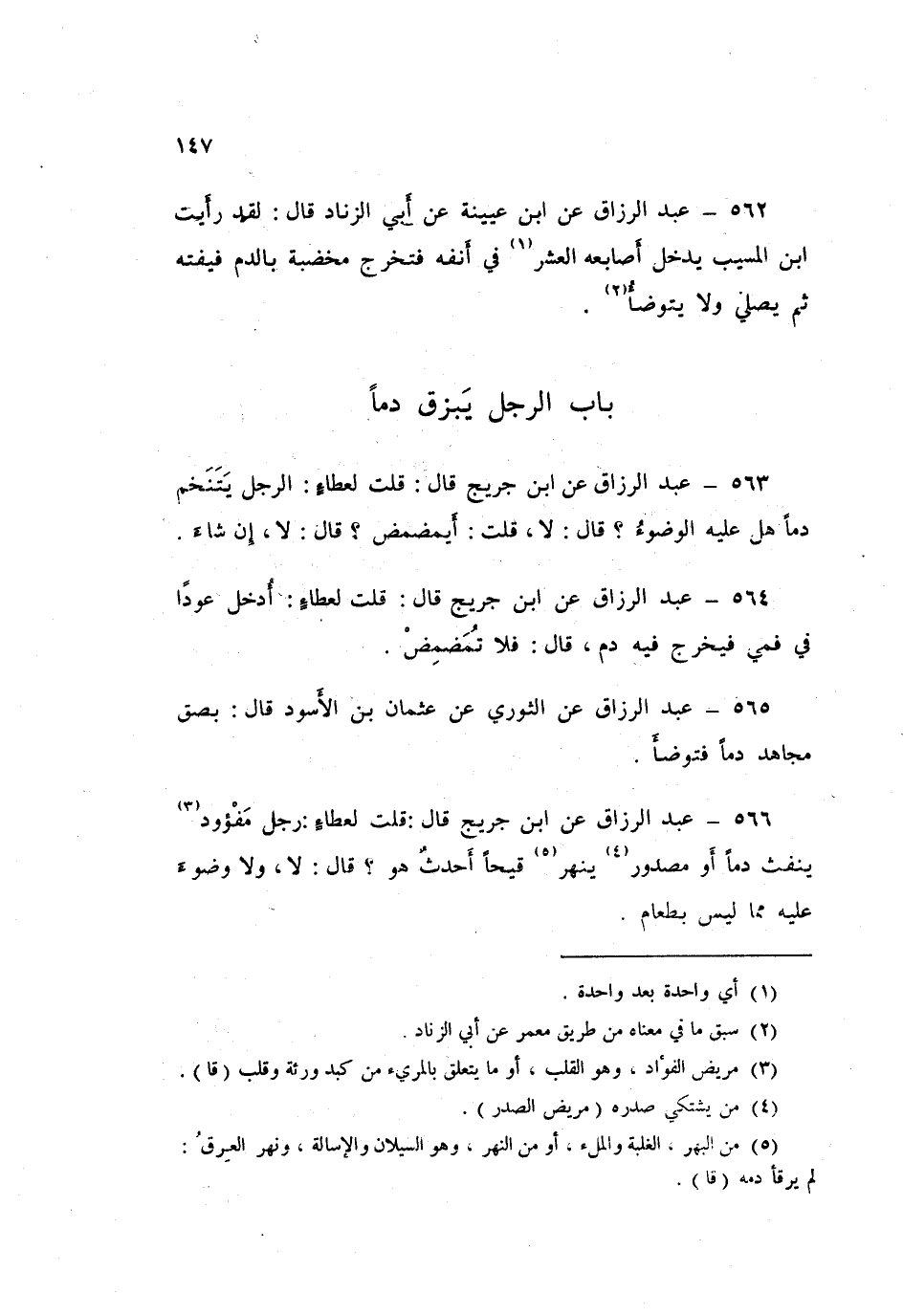 562 - عَبْدُ الرَّزَّاقِ، عَنِ ابْنِ عُيَيْنَةَ، عَنْ أَبِي الزِّنَادِ قَالَ: لَقَدْ رَأَيْتُ ابْنَ الْمُسَيِّبِ «§يُدْخِلُ أَصَابِعَهُ الْعَشْرَ فِي أَنْفِهِ، فَتَخْرُجُ مُخَضَّبَةً بِالدَّمِ فَيَفُتُّهُ، ثُمَّ يُصَلِّي وَلَا يَتَوَضَّأُ»