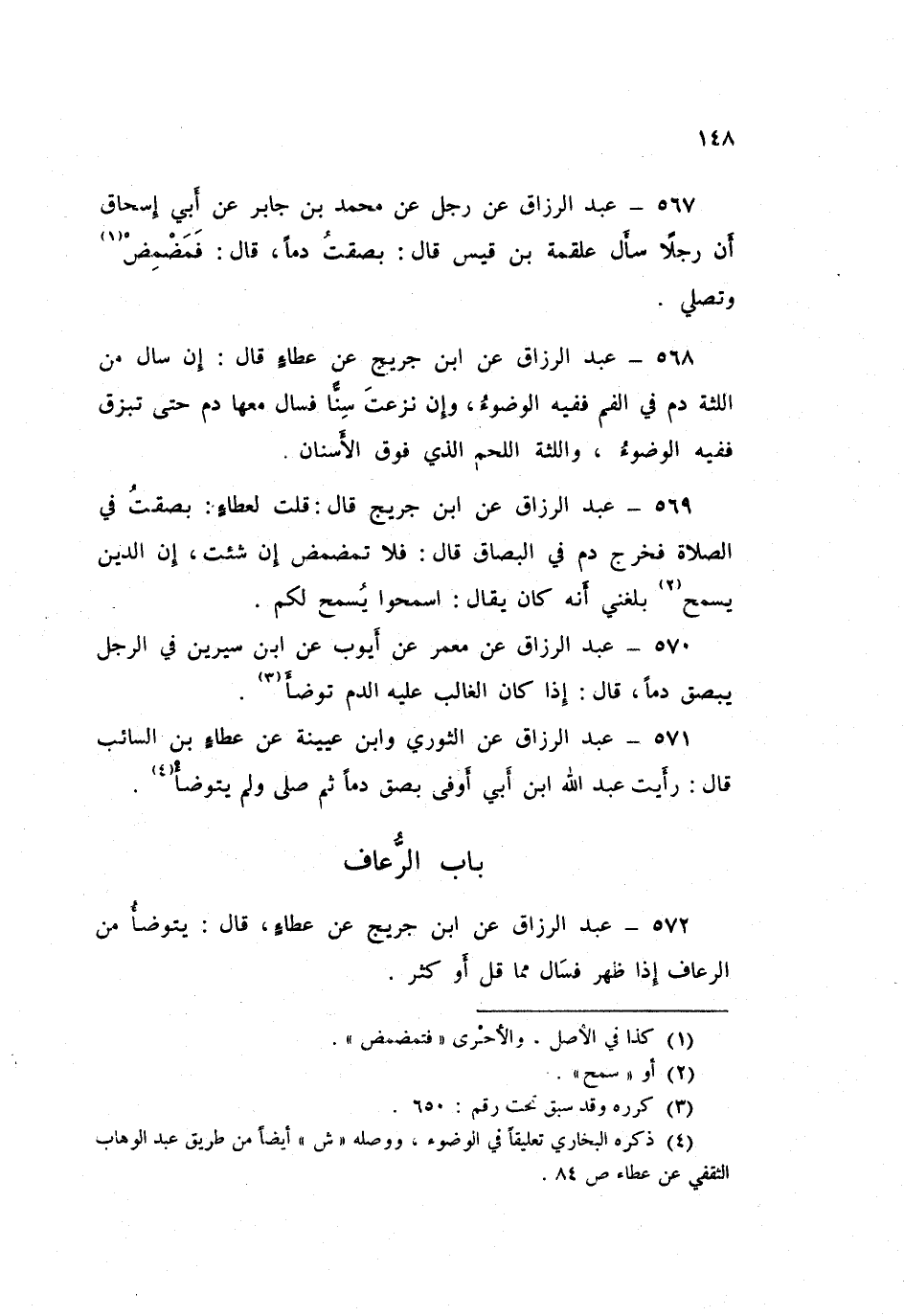 571 - عَبْدُ الرَّزَّاقِ، عَنِ الثَّوْرِيِّ، وَابْنِ عُيَيْنَةَ، عَنْ عَطَاءِ بْنِ السَّائِبِ قَالَ: رَأَيْتُ عَبْدَ اللَّهِ بْنَ أَبِي أَوْفَى، «§بَصَقَ دَمًا، ثُمَّ صَلَّى وَلَمْ يَتَوَضَّأْ»