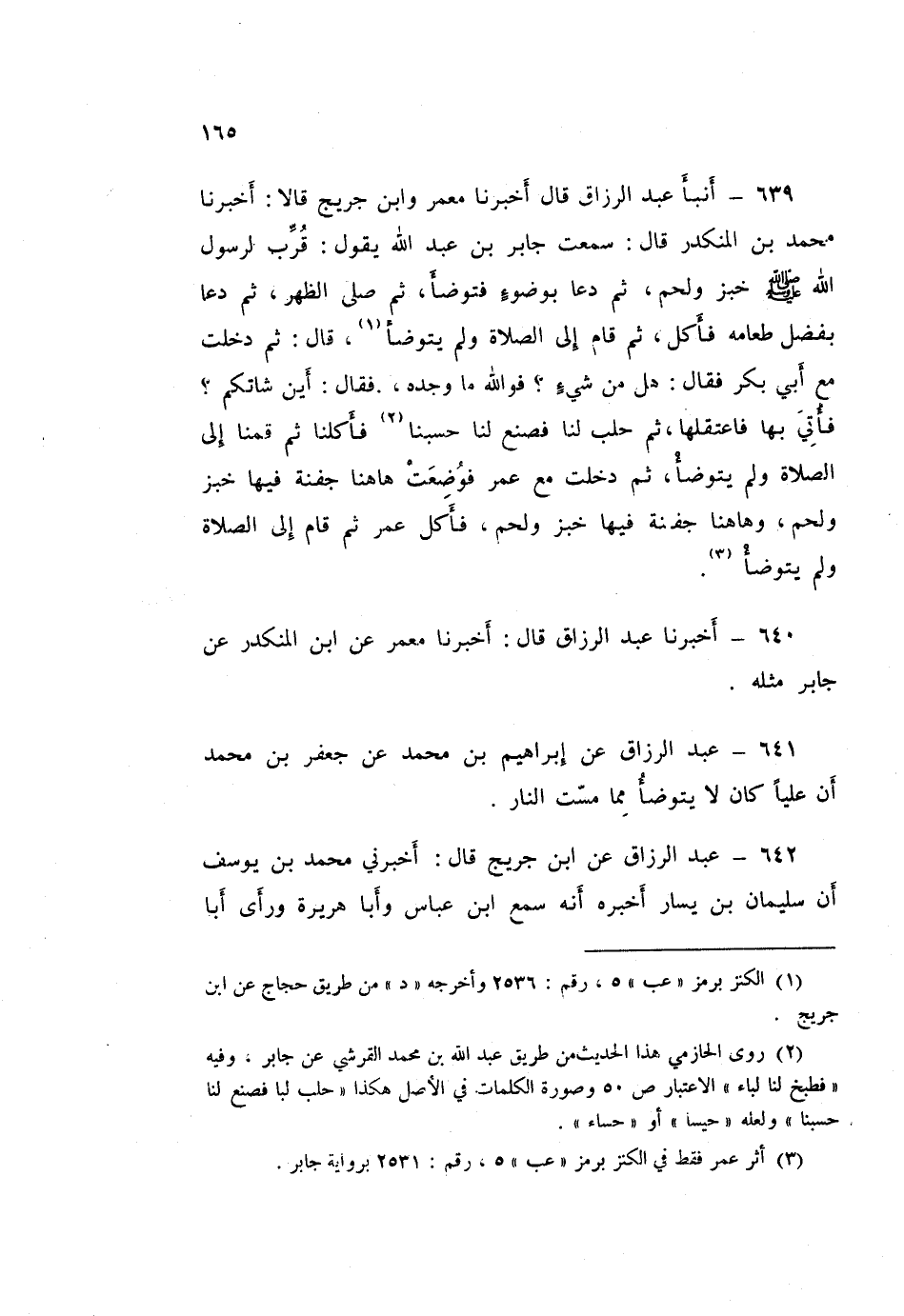 639 - أَنْبَأَ عَبْدُ الرَّزَّاقِ قَالَ: أَخْبَرَنَا مَعْمَرٌ، وَابْنُ جُرَيْجٍ، قَالَا: أَخْبَرَنَا مُحَمَّدُ بْنُ الْمُنْكَدِرِ قَالَ: سَمِعْتُ جَابِرَ بْنَ عَبْدِ اللَّهِ يَقُولُ: قُرِّبَ لِرَسُولِ اللَّهِ صَلَّى اللهُ عَلَيْهِ وَسَلَّمَ خُبْزٌ وَلَحْمٌ، ثُمَّ دَعَا بِوَضُوءٍ، §فَتَوَضَّأَ، ثُمَّ صَلَّى الظُّهْرَ، ثُمَّ دَعَا بِفَضْلِ طَعَامِهِ فَأَكَلَ، ثُمَّ قَامَ إِلَى الصَّلَاةِ وَلَمْ يَتَوَضَّأْ قَالَ: ثُمَّ دَخَلتُ مَعَ أَبِي بَكْرٍ فَقَالَ: هَلْ مِنْ شَيْءٍ؟ فَوَاللَّهِ مَا وَجَدَهُ، فَقَالَ: «أَيْنَ شَاتُكُمْ؟» فَأُتِيَ بِهَا فَاعْتَقَلَهَا، ثُمَّ حَلَبَ لَنَا فَصَنَعَ لَنَا حَيْسًا، فَأَكَلْنَا، ثُمَّ قُمْنَا إِلَى الصَّلَاةِ وَلَمْ يَتَوَضَّأْ، ثُمَّ دَخَلْتُ مَعَ عُمَرَ فَوُضِعَتْ هَاهَنَا جَفْنَةٌ فِيهَا خُبْزٌ وَلَحْمٌ، وَهَاهَنَا جَفْنَةٌ فِيهَا خُبْزٌ وَلَحْمٌ، فَأَكَلَ عُمَرُ، ثُمَّ قَامَ إِلَى الصَّلَاةِ وَلَمْ يَتَوَضَّأْ.