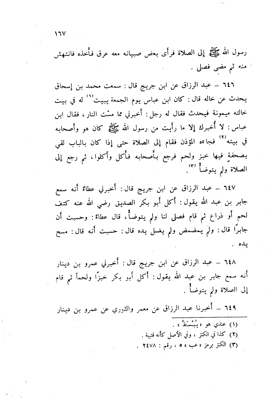 646 - عَبْدُ الرَّزَّاقِ، عَنِ ابْنِ جُرَيْجٍ قَالَ: سَمِعْتُ مُحَمَّدَ بْنَ إِسْحَاقَ يُحَدِّثُ، عَنْ خَالِهِ قَالَ: كَانَ ابْنُ عَبَّاسٍ يوْمَ الْجُمُعَةِ يُبَيَّتُ لَهُ فِي بَيْتِ خَالَتِهِ مَيْمُونَةَ فَيُحَدِّثُ فَقَالَ لَهُ رَجُلٌ: أَخْبِرْنِي مِمَّا مَسَّتِ النَّارُ، فَقَالَ ابْنُ عَبَّاسٍ: «§لَا أُخْبِرُكَ إِلَّا مَا رَأَيْتُ مِنْ رَسُولِ اللَّهِ صَلَّى اللهُ عَلَيْهِ وَسَلَّمَ، كَانَ هُوَ وَأَصْحَابُهُ فِي بَيْتِهِ، فَجَاءَهُ الْمُؤَذِّنُ فَقَامَ إِلَى الصَّلَاةِ حَتَّى إِذَا كَانَ بِالْبَابِ لُقِيَ بِصَحْفَةٍ فِيهَا خُبْزٌ وَلَحْمٌ فَرَجَعَ بِأَصْحَابِهِ فَأَكَلَ وَأَكَلُوا، ثُمَّ رَجَعَ إِلَى الصَّلَاةِ وَلَمْ يَتَوَضَّأْ»