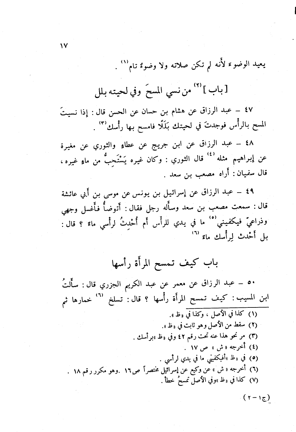 50 - عَبْدُ الرَّزَّاقِ، عَنْ مَعْمَرٍ، عَنْ عَبْدِ الْكَرِيمِ الْجَزَرِيِّ قَالَ: سَأَلْتُ ابْنَ الْمُسَيِّبِ، §كَيْفَ تَمْسَحُ الْمَرْأَةُ رَأْسَهَا؟ قَالَ: «تَسْلَخُ خِمَارَهَا، ثُمَّ تَمْسَحُ رَأْسَهَا»