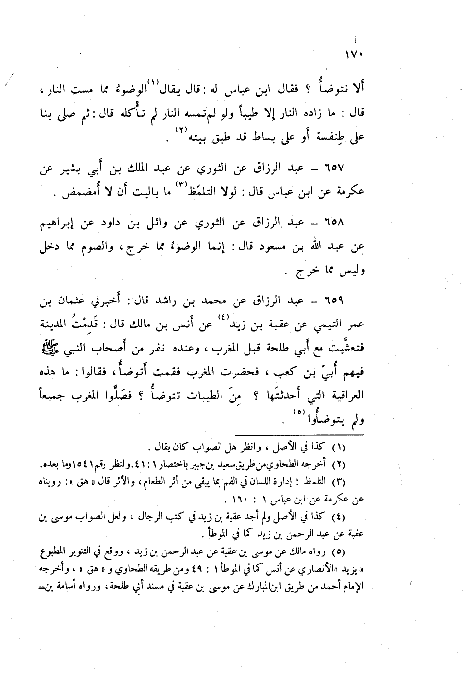 659 - عَبْدُ الرَّزَّاقِ، عَنْ مُحَمَّدِ بْنِ رَاشِدٍ قَالَ: أَخْبَرَنِي عُثْمَانُ بْنُ عُمَرَ التَّيْمِيُّ، عَنْ عُقْبَةَ بْنِ زَيْدٍ، عَنْ أَنَسِ بْنِ مَالِكٍ قَالَ: " قَدِمْتُ الْمَدِينَةَ §فَتَعَشَّيْتُ مَعَ أَبِي طَلْحَةَ قَبْلَ الْمَغْرِبِ وَعِنْدَهُ نَفَرٌ مِنْ أَصْحَابِ النَّبِيِّ صَلَّى اللهُ عَلَيْهِ وَسَلَّمَ، فِيهِمْ أُبَيُّ بْنُ كَعْبٍ فَحَضَرَتِ الْمَغْرِبُ فَقُمْتُ أَتَوَضَّأُ فَقَالُوا: مَا هَذِهِ الْعِرَاقِيَّةُ الَّتِي أَحْدَثْتَهَا، مِنَ الطَّيِّبَاتِ تَتَوَضَّأُ ؟ فَصَلَّوُا الْمَغْرِبَ جَمِيعًا وَلَمْ يَتَوَضَّئُوا "