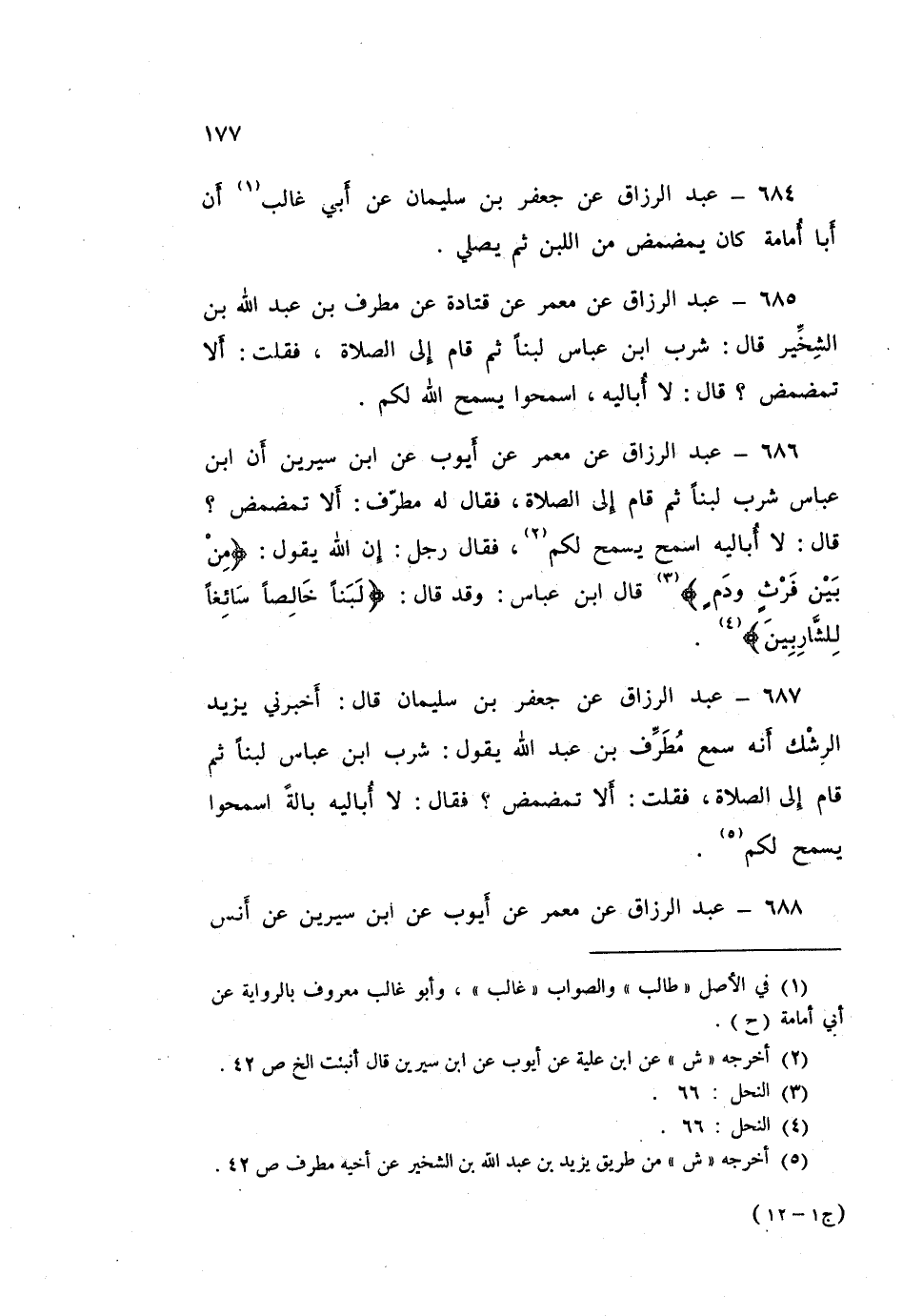686 - عَبْدُ الرَّزَّاقِ، عَنْ مَعْمَرٍ، عَنْ أَيُّوبَ، عَنِ ابْنِ سِيرِينَ، أَنَّ ابْنَ عَبَّاسٍ شَرِبَ لَبَنًا، ثُمَّ قَامَ إِلَى الصَّلَاةِ، فَقَالَ لَهُ مُطَرِّفٌ: أَلَا تُمَضْمِضُ؟ قَالَ: «لَا أُبَالِيهِ §اسْمَحْ يُسْمَحْ لَكُمْ»، فَقَالَ رَجُلٌ: إِنَّ اللَّهَ يَقُولُ: {مِنْ بَيْنِ فَرْثٍ وَدَمٍ} [النحل: 66]، قَالَ ابْنُ عَبَّاسٍ: " وَقَدْ قَالَ: {لَبَنًا خَالِصًا سَائِغًا لِلشَّارِبِينَ} [النحل: 66] "