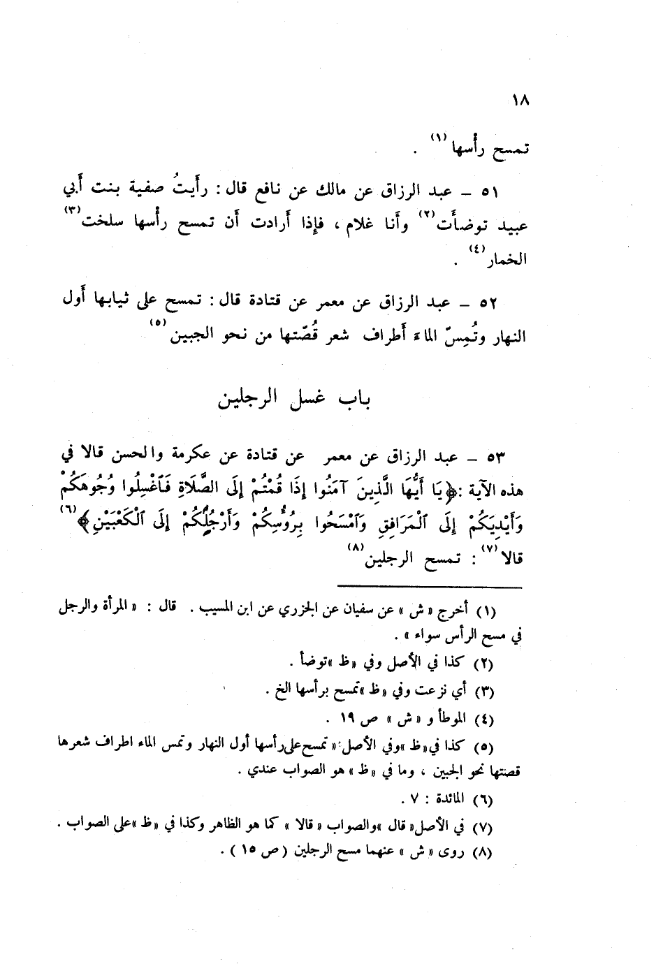 53 - عَبْدُ الرَّزَّاقِ، عَنْ مَعْمَرٍ، عَنْ قَتَادَةَ، عَنْ عِكْرِمَةَ، وَالْحَسَنِ، قَالَا: فِي هَذِهِ الْآيَةِ {يَا أَيُّهَا الَّذِينَ آمَنُوا إِذَا قُمْتُمْ إِلَى الصَّلَاةِ فَاغْسِلُوا وُجُوهَكُمْ وَأَيْدِيَكُمْ إِلَى الْمَرَافِقِ وَامْسَحُوا بِرُءُوسِكُمْ وَأَرْجُلَكُمْ إِلَى الْكَعْبَيْنِ}، قَالَا: «§تَمْسَحُ الرِّجْلَيْنِ»