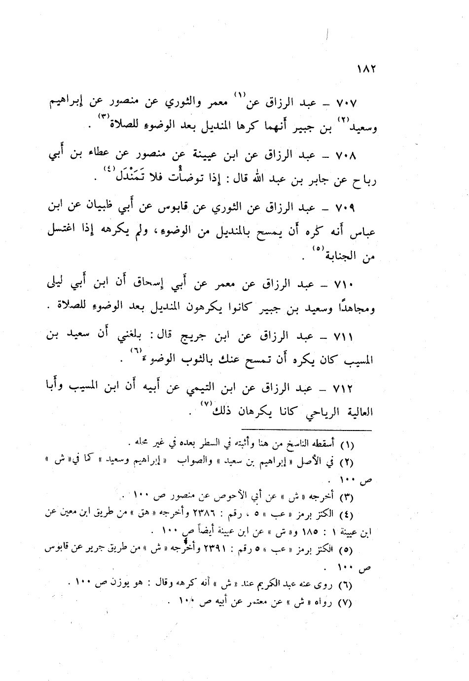 707 - عَبْدُ الرَّزَّاقِ، عَنْ مَعْمَرٍ، وَالثَّوْرِيِّ، عَنْ مَنْصُورٍ، عَنْ إِبْرَاهِيمَ، وَسَعِيدِ بْنِ جُبَيْرٍ أَنَّهُمَا §كَرِهَا الْمِنْدِيلَ بَعْدَ الْوُضُوءِ لِلصَّلَاةِ
