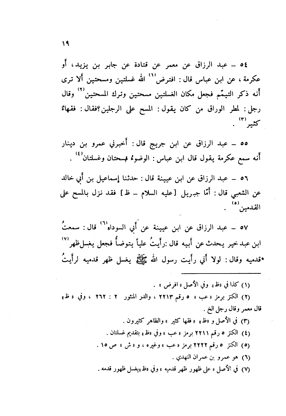 56 - عَبْدُ الرَّزَّاقِ، عَنِ ابْنِ عُيَيْنَةَ قَالَ: حَدَّثَنَا إِسْمَاعِيلُ بْنُ أَبِي خَالِدٍ، عَنِ الشَّعْبِيِّ قَالَ: «§أَمَّا جِبْرِيلُ عَلَيْهِ السَّلَامُ فَقَدْ نَزَلَ بِالْمَسْحِ عَلَى الْقَدَمَيْنِ»