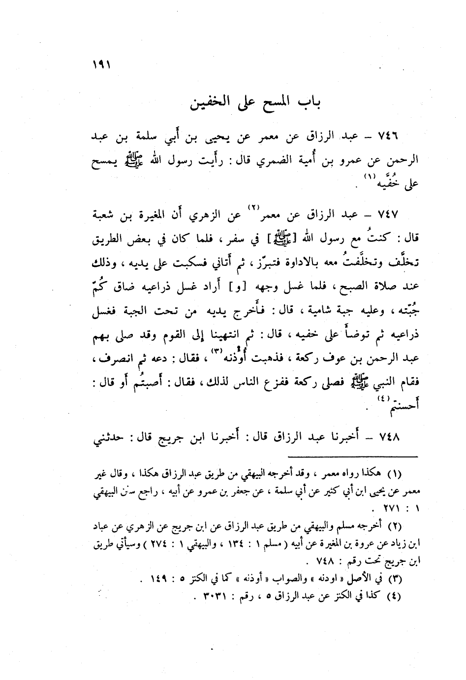 746 - عَبْدُ الرَّزَّاقِ، عَنْ مَعْمَرٍ، عَنْ يَحْيَى عَنْ أَبِي سَلَمَةَ بْنِ عَبْدِ الرَّحْمَنِ، عَنْ عَمْرِو بْنِ أُمَيَّةَ الضَّمَرِيِّ قَالَ: رَأَيْتُ رَسُولَ اللَّهِ صَلَّى اللهُ عَلَيْهِ وَسَلَّمَ «§يَمْسَحُ عَلَى خُفَّيْهِ»