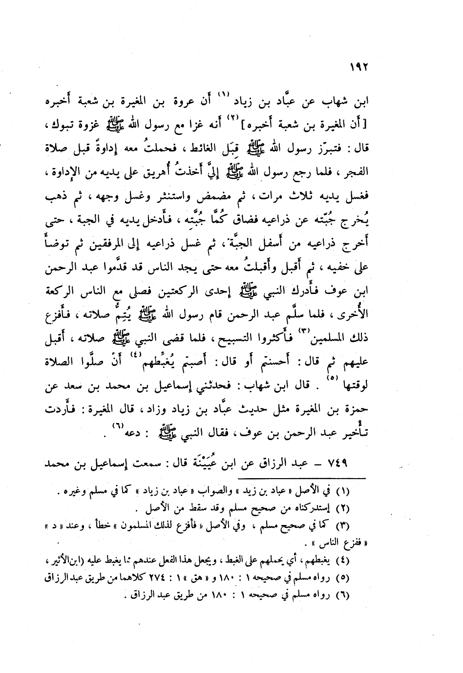 749 - عَبْدُ الرَّزَّاقِ، عَنِ ابْنِ عُيَيْنَةَ قَالَ: سَمِعْتُ إِسْمَاعِيلَ بْنَ مُحَمَّدِ بْنِ سَعْدٍ يَقُولُ: حَدَّثَنِي حَمْزَةُ بْنُ الْمُغِيرَةِ بْنِ شُعْبَةَ، عَنْ أَبِيهِ قَالَ: كُنْتُ مَعَ رَسُولِ اللَّهِ صَلَّى اللهُ عَلَيْهِ وَسَلَّمَ فِي سَفَرٍ فَقَالَ: «§تَخَلَّفْ يَا مُغِيرَةُ وَامْضُوا أَيُّهَا النَّاسُ» قَالَ: ثُمَّ ذَهَبَ فَقَضَى حَاجَتَهُ، ثُمَّ اتَّبَعْتُهُ بِإِدَاوَةٍ مِنْ مَاءٍ، فَلَمَّا فَرَغَ سَكَبْتُ عَلَيْهِ مِنْهَا، فَغَسَلَ وَجْهَهُ ثُمَّ ذَهَبَ يُخْرِجُ يَدَيْهِ مِنْ جُبَّةٍ عَلَيْهِ رُومِيَّةٍ، فَضَاقَ كُمَّا الْجُبَّةِ فَأَخْرَجَ يَدَيْهِ مِنْ تَحْتِ الْجُبَّةِ فَغَسَلَهُمَا، ثُمَّ مَسَحَ عَلَى خُفَّيْهِ، ثُمَّ صَلَّى