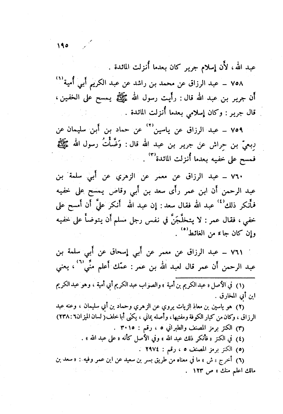758 - عَبْدُ الرَّزَّاقِ، عَنْ مُحَمَّدِ بْنِ رَاشِدٍ، عَنْ عَبْدِ الْكَرِيمِ أَبِي أُمَيَّةَ، أَنَّ جَرِيرَ بْنَ عَبْدِ اللَّهِ قَالَ: رَأَيْتُ رَسُولَ اللَّهِ صَلَّى اللهُ عَلَيْهِ وَسَلَّمَ، «§يَمْسَحُ عَلَى الْخُفَّيْنِ». قَالَ جَرِيرٌ: «وَكَانَ إِسْلَامِي بَعْدَمَا أُنْزِلتِ الْمَائِدَةُ»