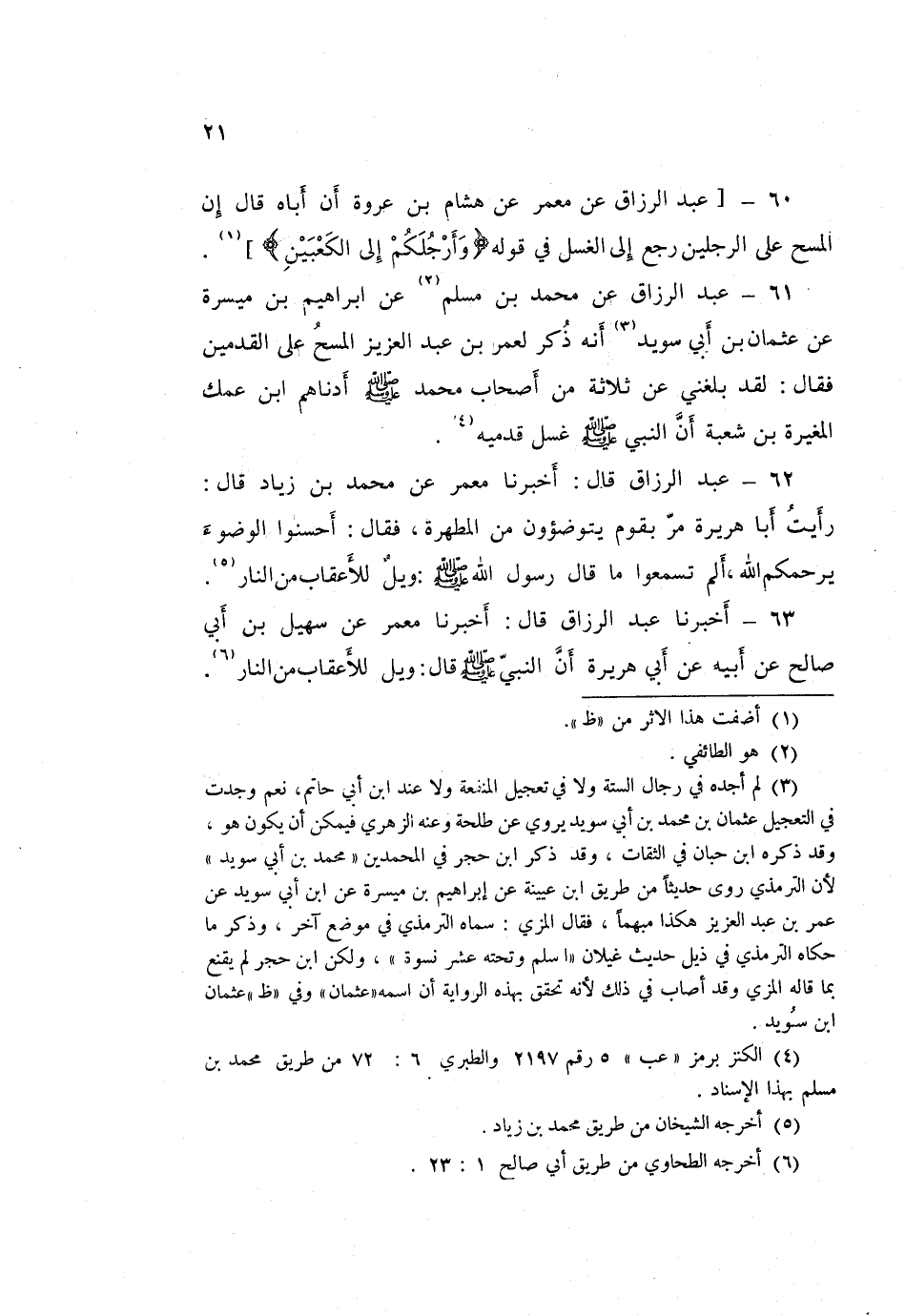 61 - عَبْدُ الرَّزَّاقِ، عَنْ مُحَمَّدِ بْنِ مُسْلِمٍ، عَنْ إِبْرَاهِيمَ بْنِ مَيْسَرَةَ، عَنْ عُثْمَانَ بْنِ أَبِي سُوَيْدٍ، أَنَّهُ ذَكَرَ لِعُمَرَ بْنِ عَبْدِ الْعَزِيزِ الْمَسْحَ عَلَى الْقَدَمَيْنِ فَقَالَ: لَقَدْ بَلَغَنِي عَنْ ثَلَاثَةٍ مِنْ أَصْحَابِ مُحَمَّدٍ صَلَّى اللهُ عَلَيْهِ وَسَلَّمَ أَدْنَاهُمُ ابْنُ عَمِّكَ الْمُغِيرَةُ بْنُ شُعْبَةَ، أَنَّ النَّبِيَّ صَلَّى اللهُ عَلَيْهِ وَسَلَّمَ «§غَسَلَ قَدَمَيْهِ»